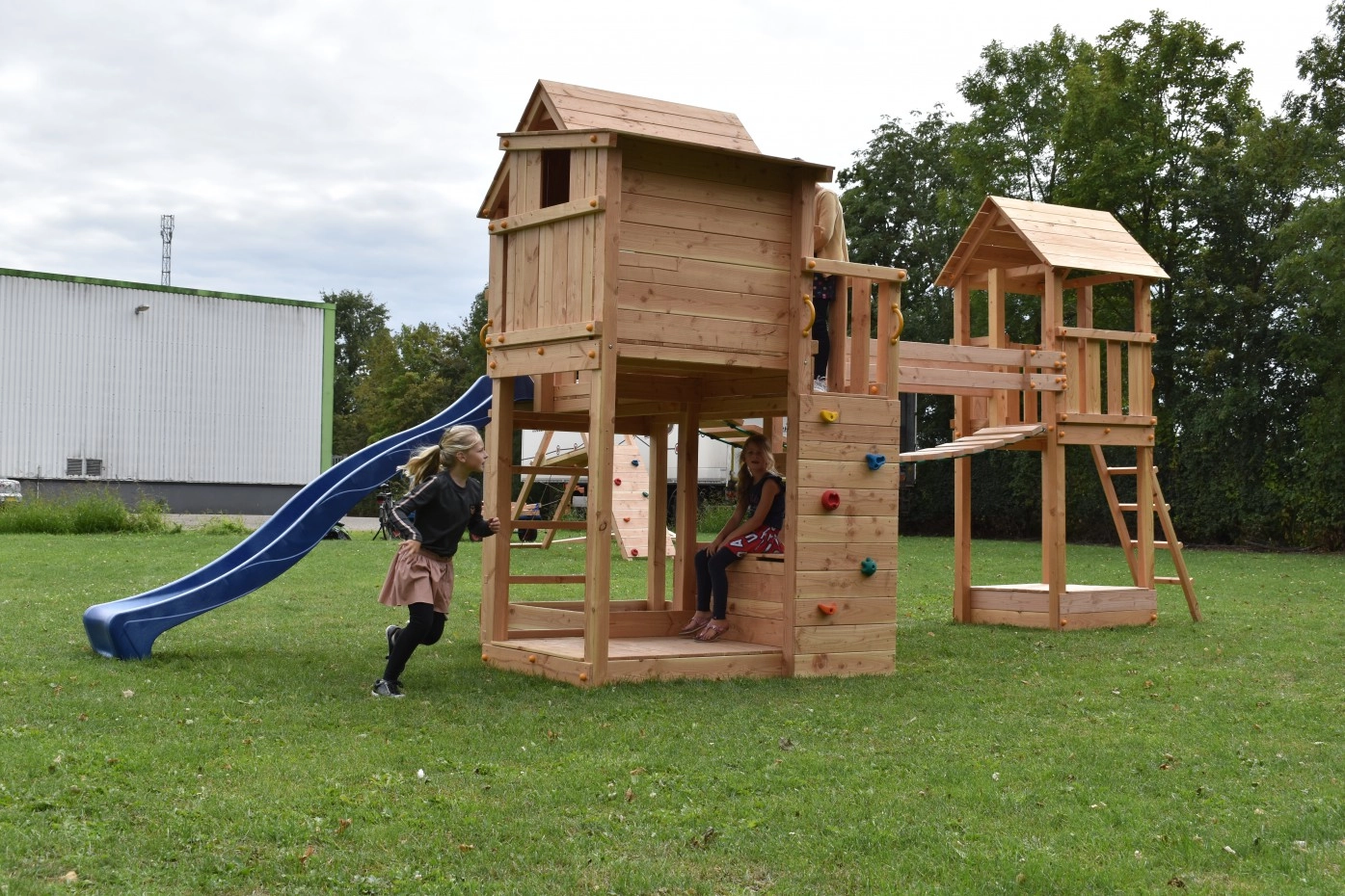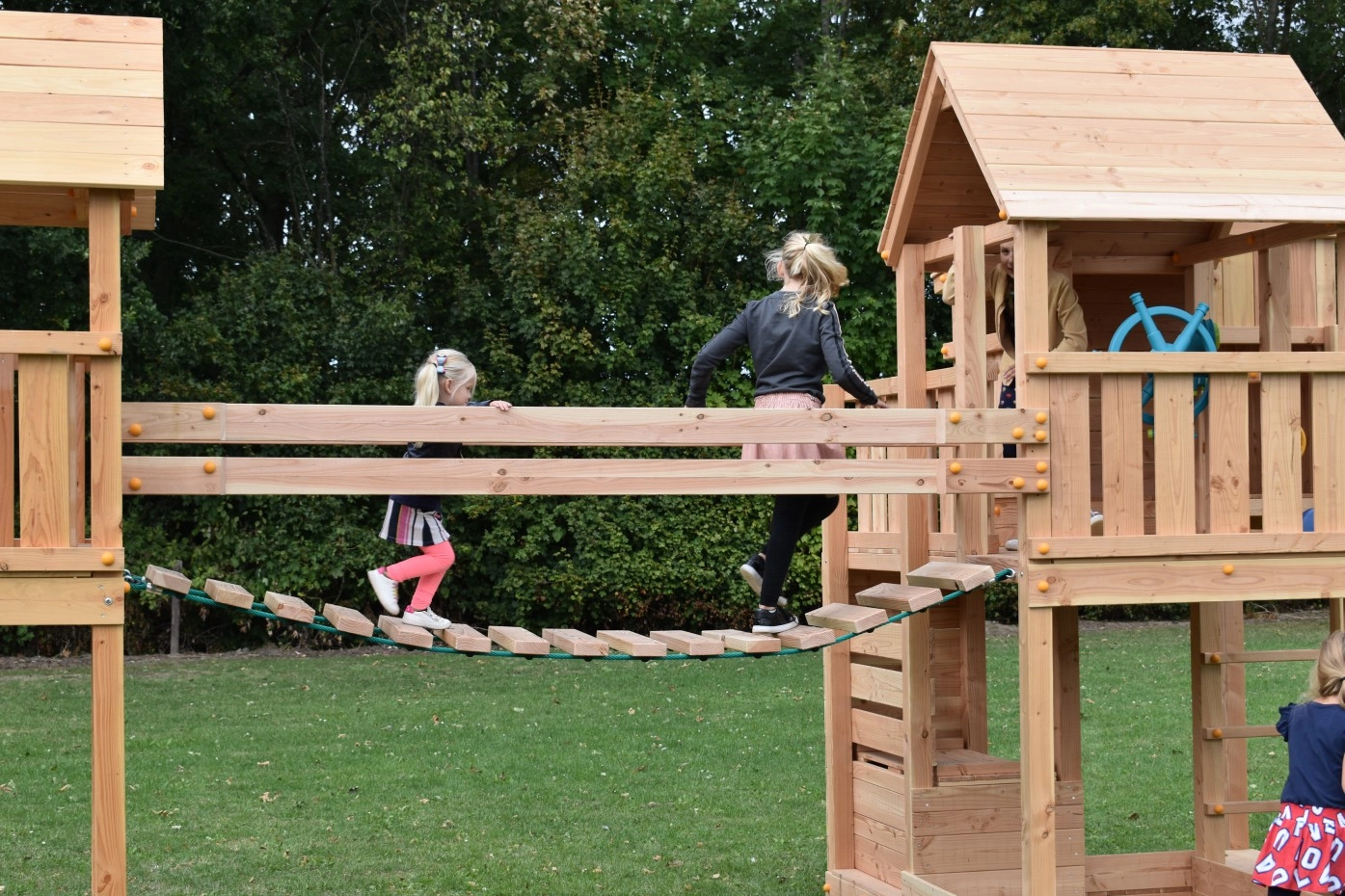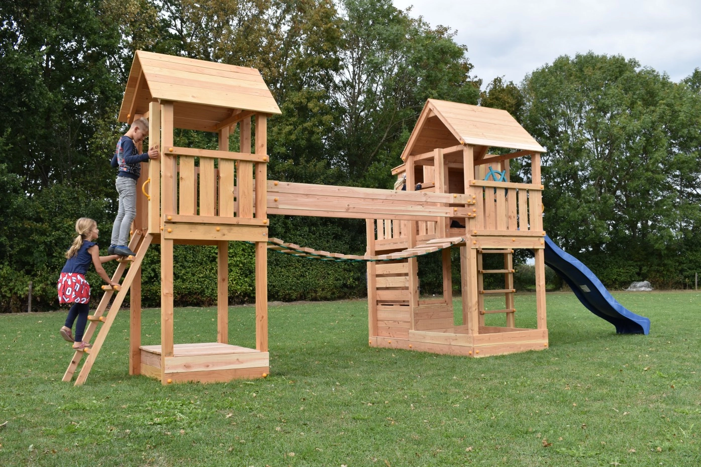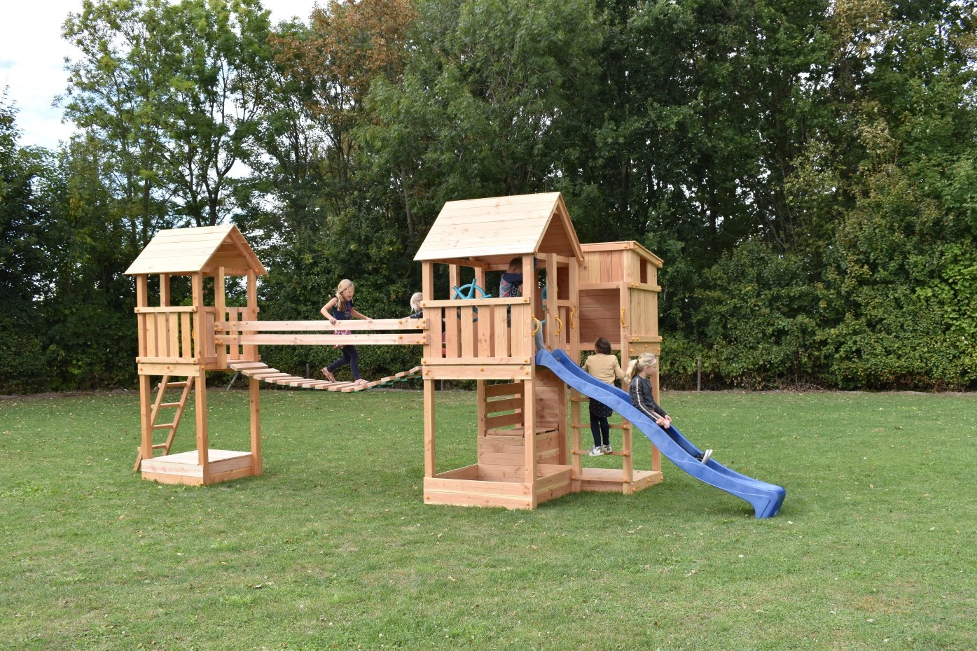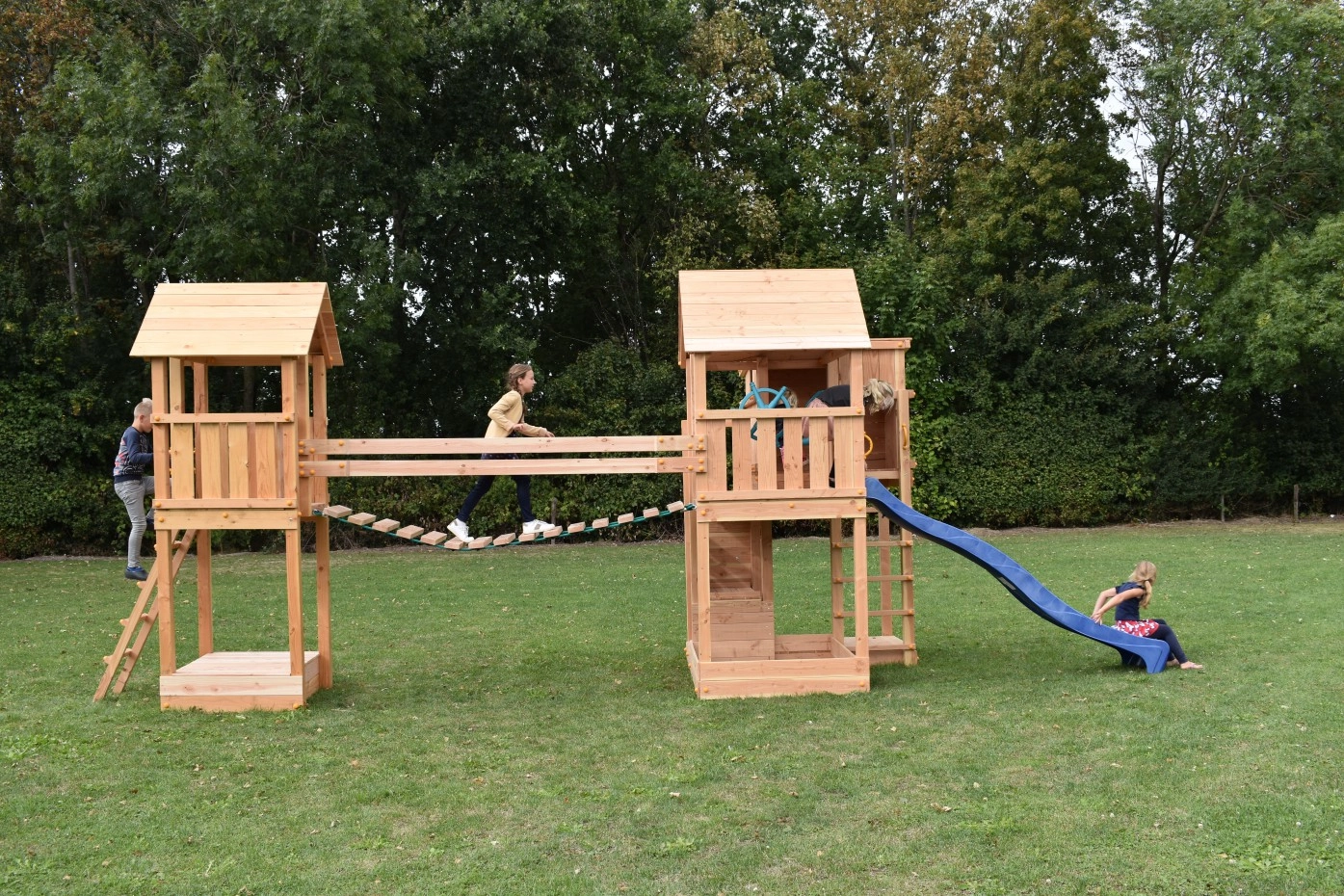 Speeltoestel Yard is een unieke combinatie van 2 speeltoestellen met een wiebelbrug ertussen. De speeltoestellen zijn de Palazzo en de Kiosk, beide van het merk Blue-Rabbit. Speeltoren Kiosk is voorzien van een zandbak en deksel. Speelbrug Wave DLX met golvend loopdek is een geweldige ervaring voor kinderen. De speelbrug verbindt de 2 speeltorens met elkaar. Dit houten speeltoestel is een plaatje in uw tuin.