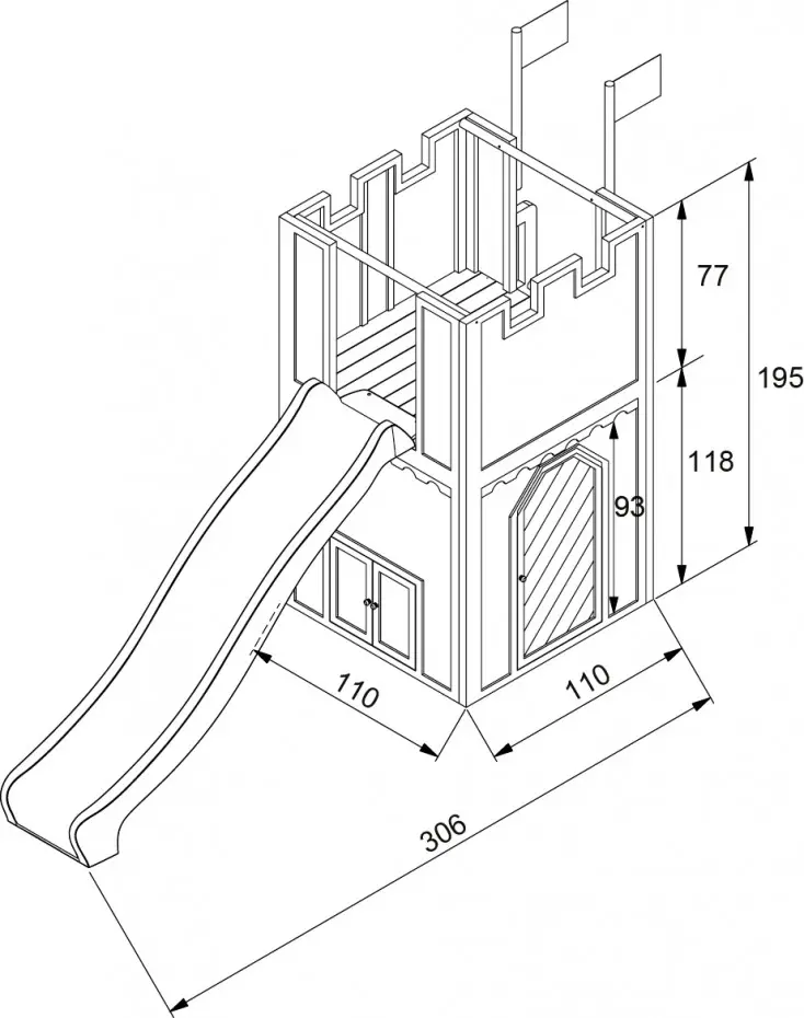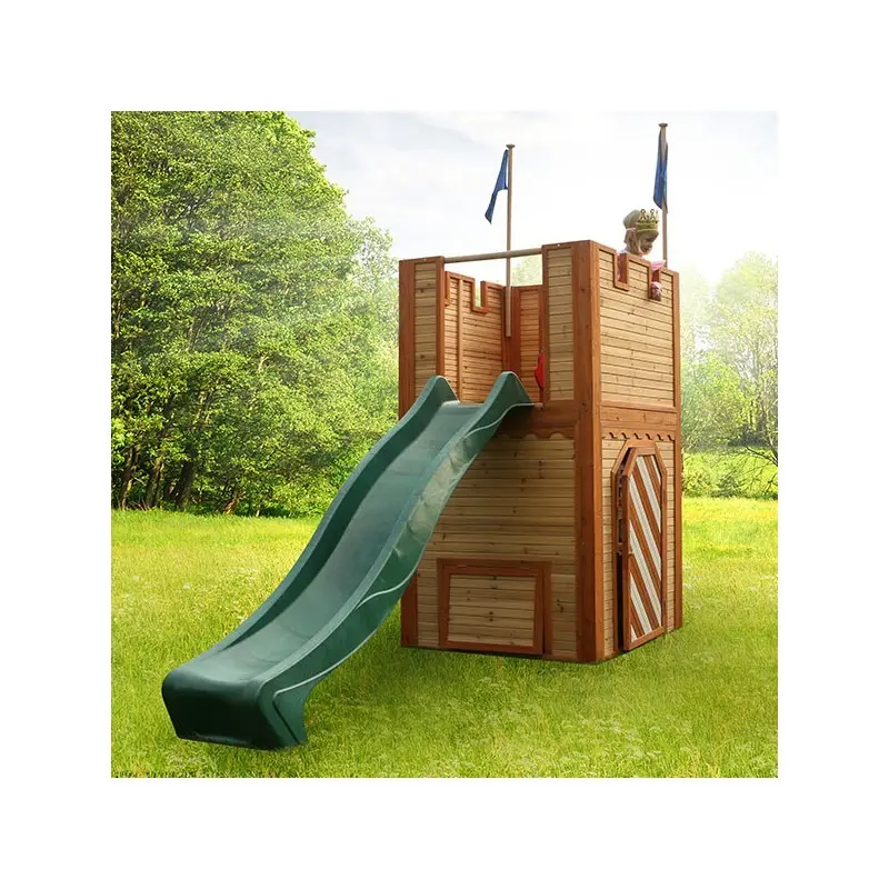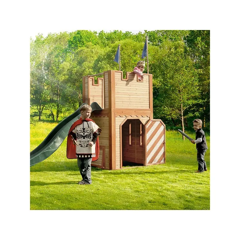 Houten speelkasteel voor stoere ridders en mooie prinsessen. Ridders, verdedig je speelkasteel en laat de gevangenen niet ontsnappen via het geheime luik! De prinsessen staan op de uitkijk en houden alles goed in de gaten. Met de spannende glijbaan zoeven ze snel weer naar beneden.