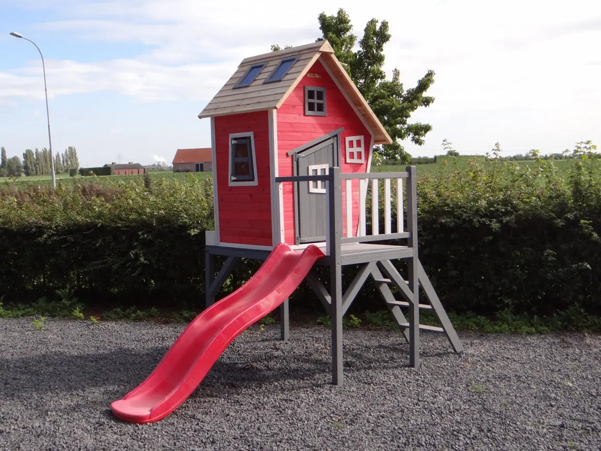 Speelhuis Rosalie met glijbaan is een modern en speels speelhuis. Het speelhuis met glijbaan staat op een plateau van 90cm hoog. Klim snel via het trapje omhoog en glij zo weer naar beneden! Het houten speelhuis is voorzien van een scheve wand, schoorsteen, deuropening en diverse ramen waarvan 1 raam open kan.