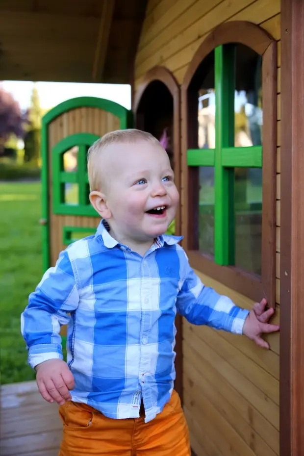 - De dikte van het hout; wanden van 15 mm en lijsten van 38 mm, maakt het speelhuis stevig en robuust, zodat het tegen een speelstootje kan.