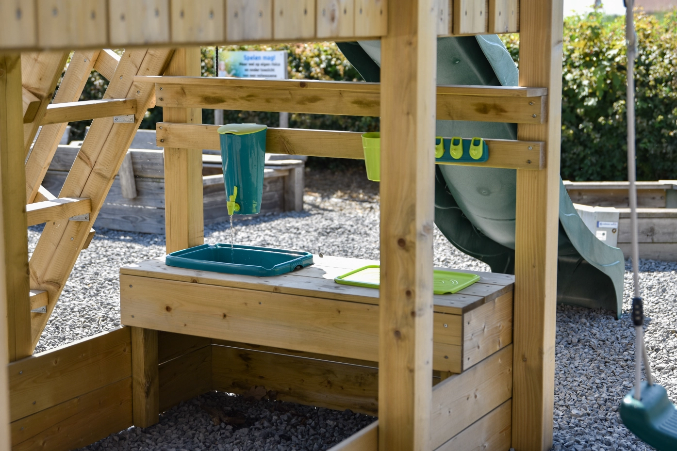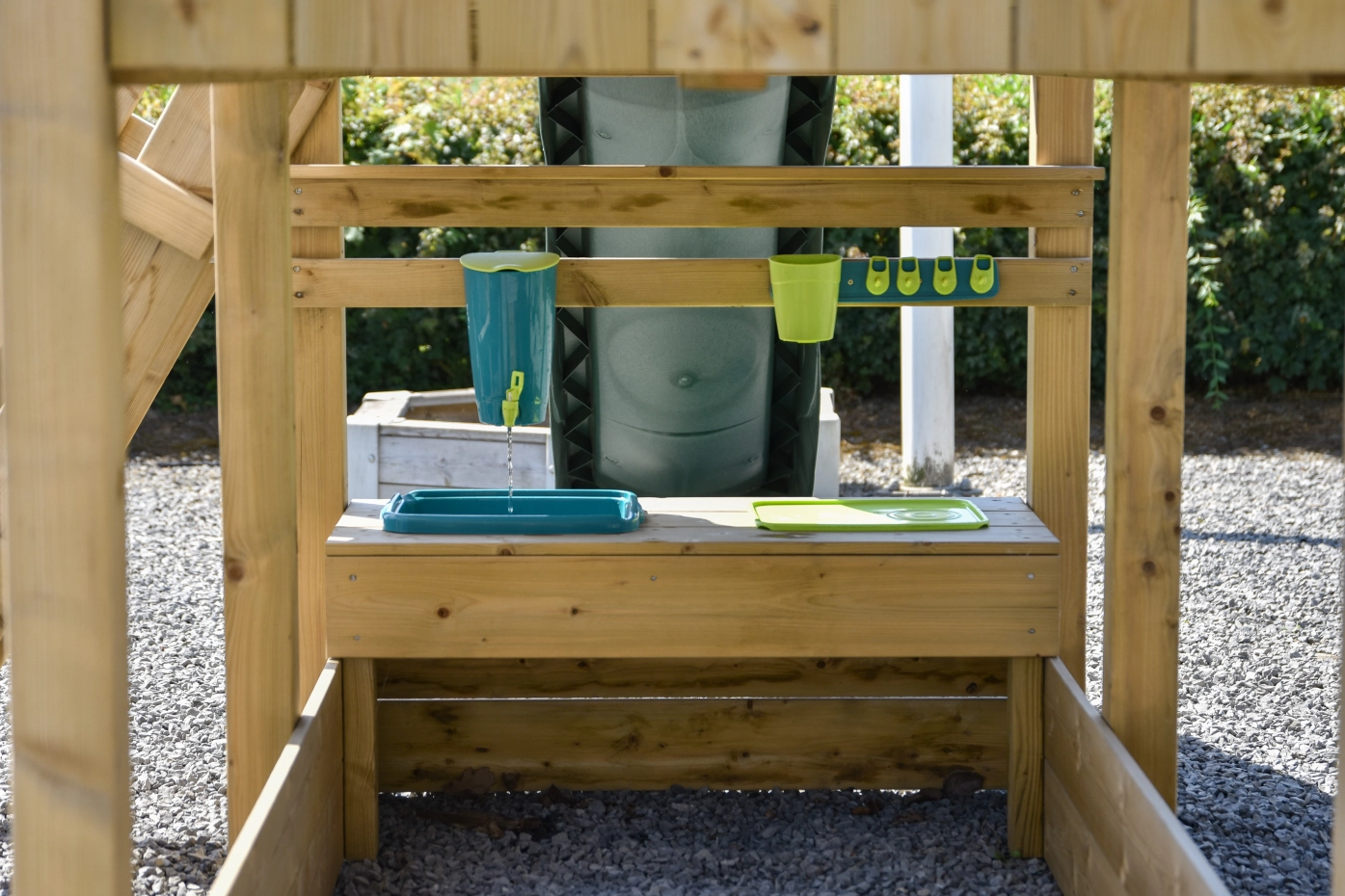 Maak de lekkerste modder cakejes en de mooiste zandtaartjes met deze houten zand- en water keuken, die perfect past onder jou speeltoestel!