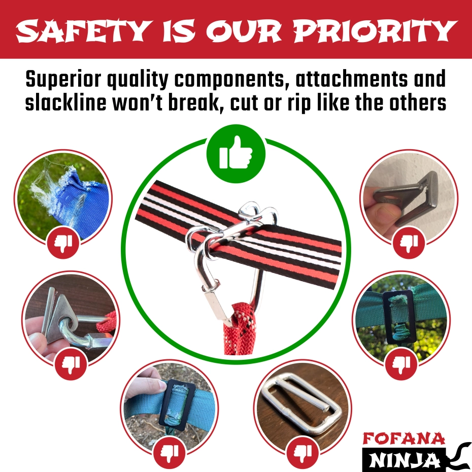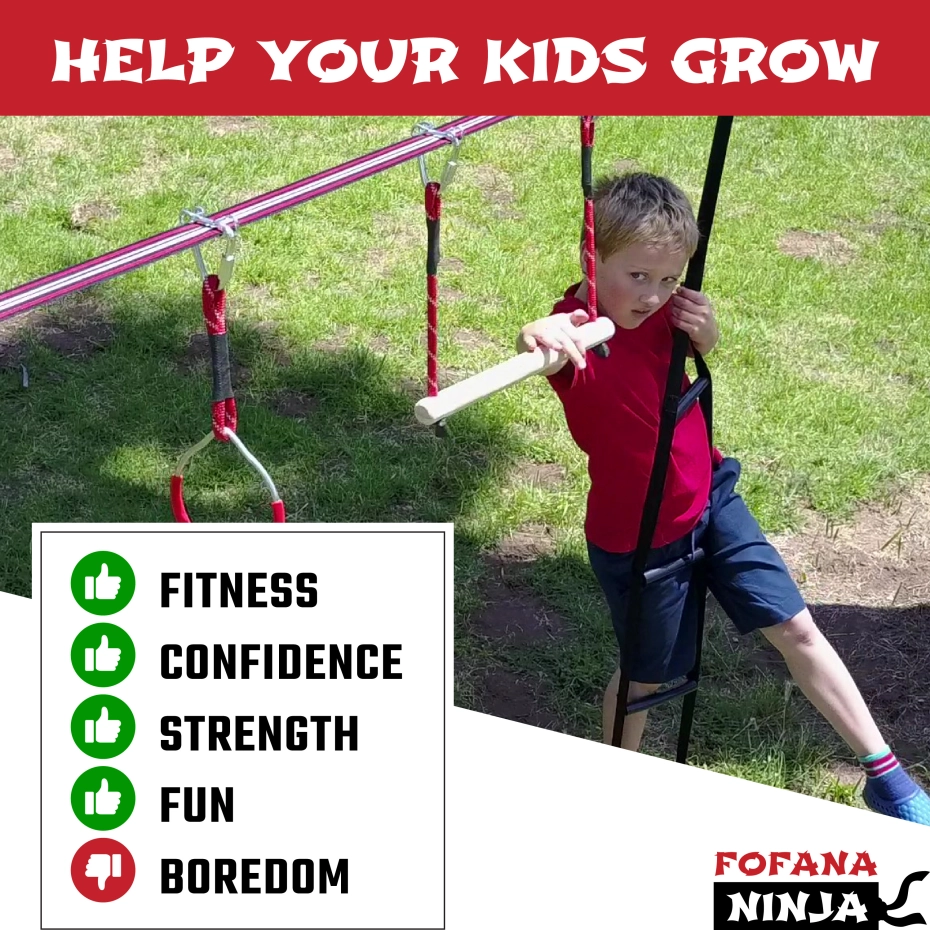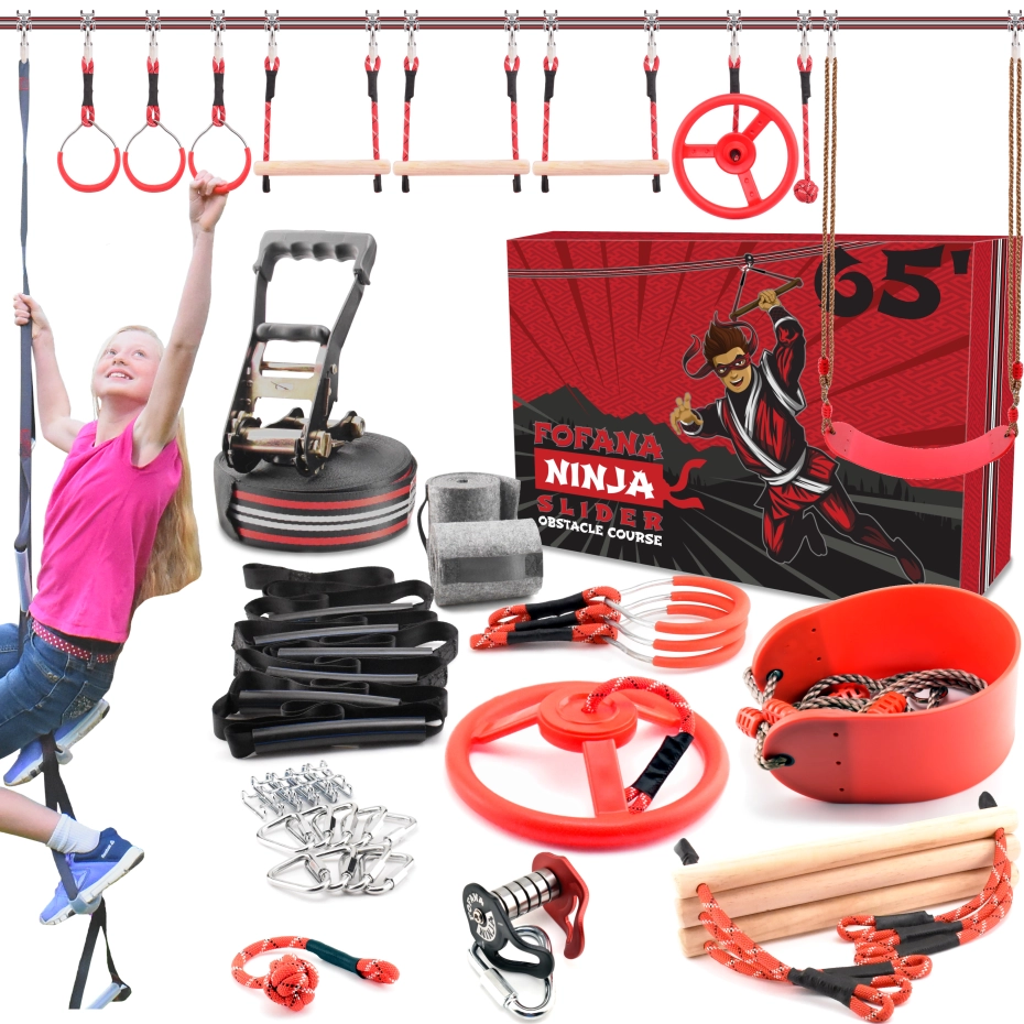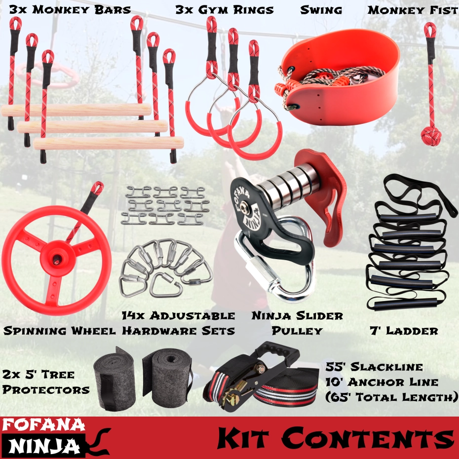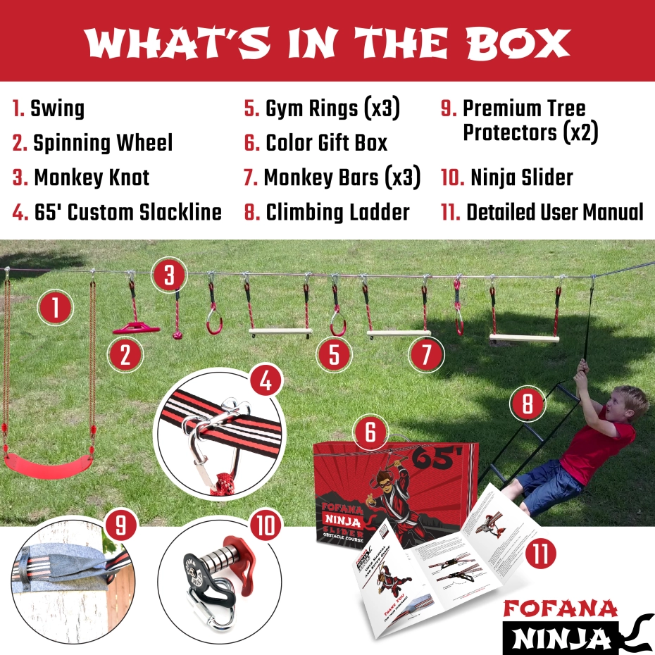 Breng spannend avontuur naar je achtertuin! Bouw het zelfvertrouwen, de coördinatie en de kracht van je kind terwijl ze trainen om een ninja te worden met je ninjastrijder-hindernisbaan voor kinderen Slack Line set met zipline-obstakel van Fofana! Geniet van spannend buitenspeelgoed dat je vaardigheden als ninjastrijder aanscherpt! Je ninjacursus klimrekset bevat een klimtouwladder, een spinnewiel, apenstangen, gymnastiekringen, een schommel en een NINJA SLIDER om er maar een paar te noemen!