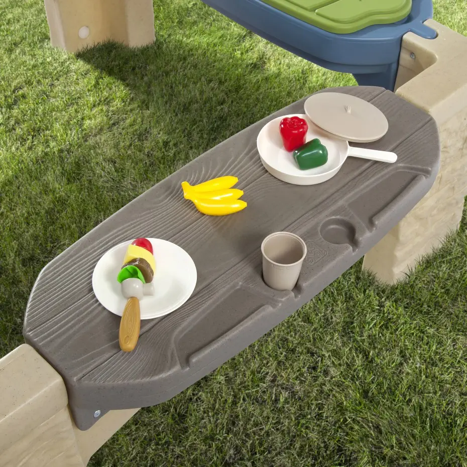 Kinderen kunnen hun eigen achtertuinfeest organiseren met de All Around Playtime Patio with Canopy van Step2! Dit speelhuisje voor kinderen heeft een aantrekkelijk en realistisch, gestapeld ontwerp dat past in elke tuinomgeving. Kinderen zullen zich uren kunnen vermaken met het koken in de fantasiespeelkeuken net als mama en papa. De kleintjes zullen genieten van het wachten op het "diner" met de bijgevoegde speeltafel met zand en water. Als het eten klaar is, kunnen kinderen aan de snacktafel eten van het meegeleverde servies-set in hun ultieme speelrestaurant.