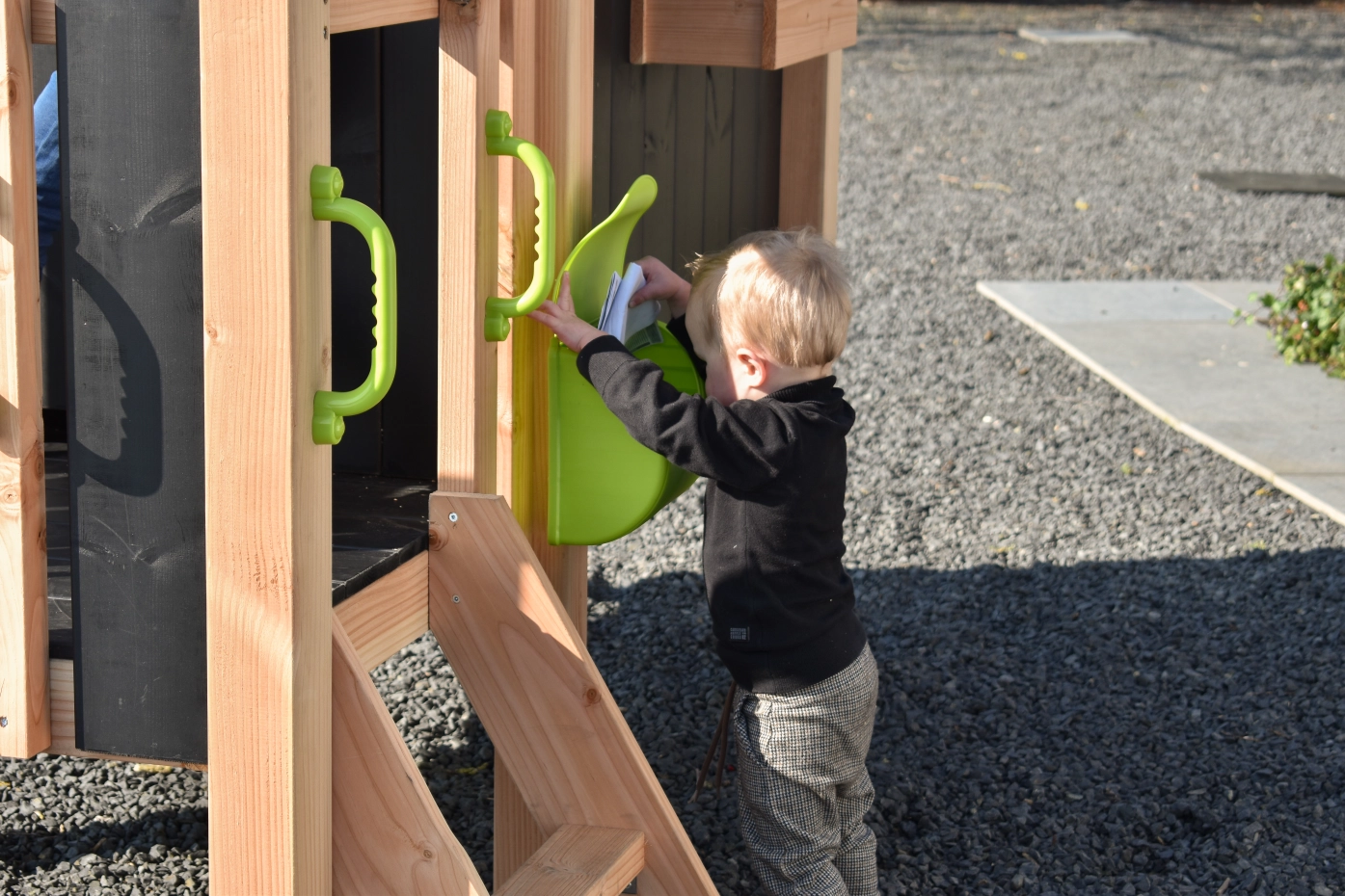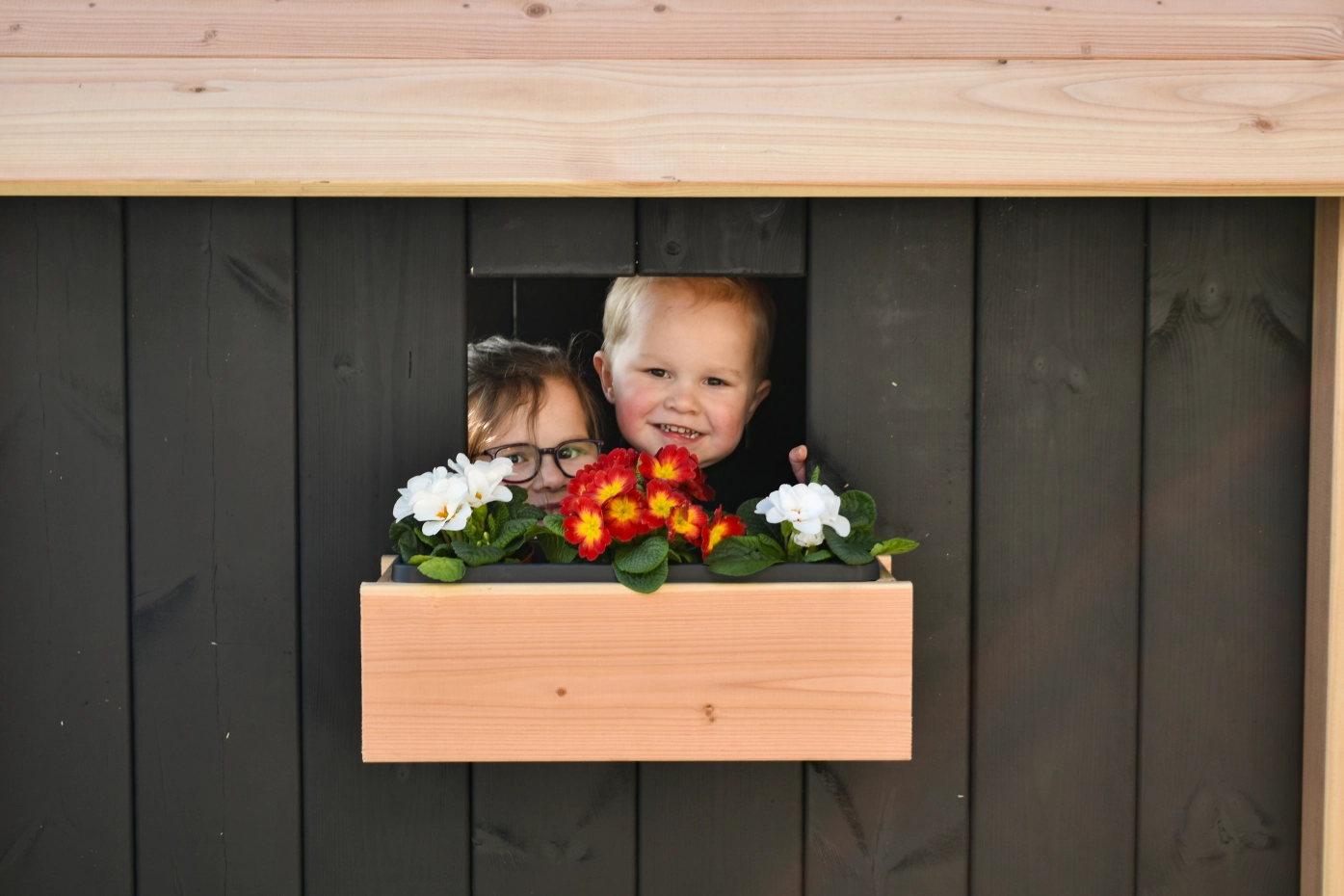 Aan de zijkant zit een leuk bloembakje bij het raam, perfect om samen bloemetjes of plantjes in te zetten. Binnenkomen doe je via het speelse deurtje, en dankzij de reling rondom het platform is het veilig om te spelen. Een heerlijk huisje voor eindeloze buitendagen vol fantasie en plezier!