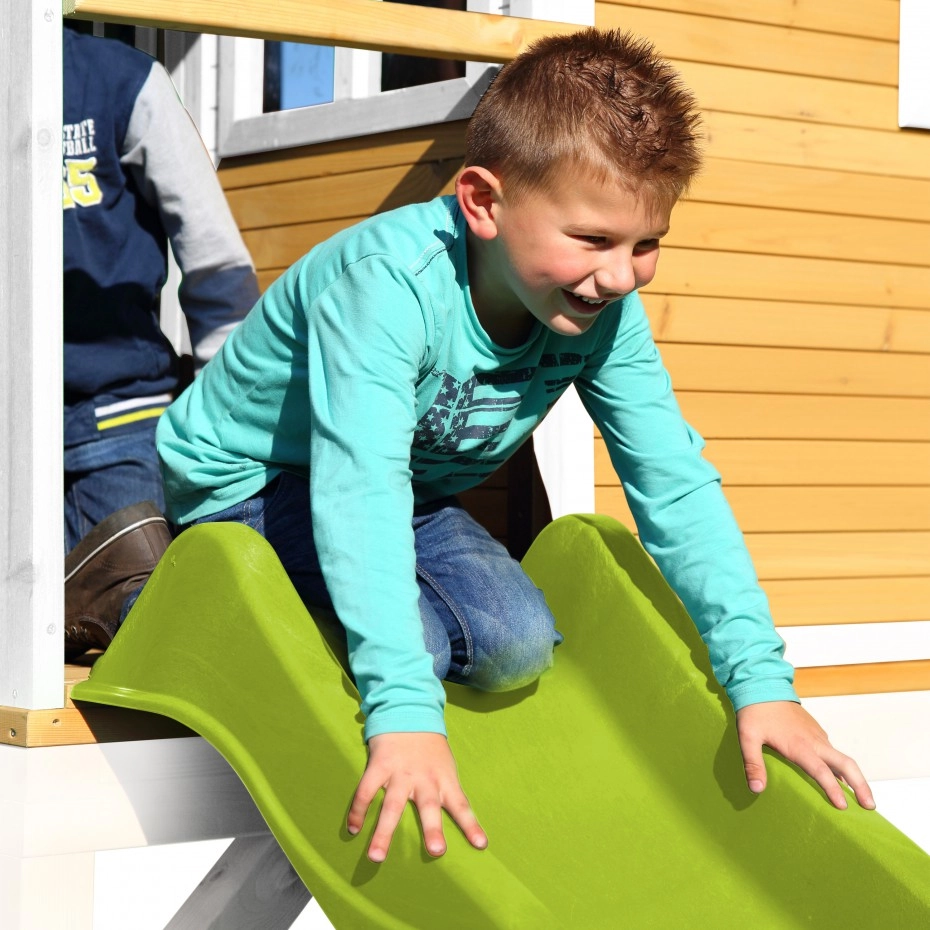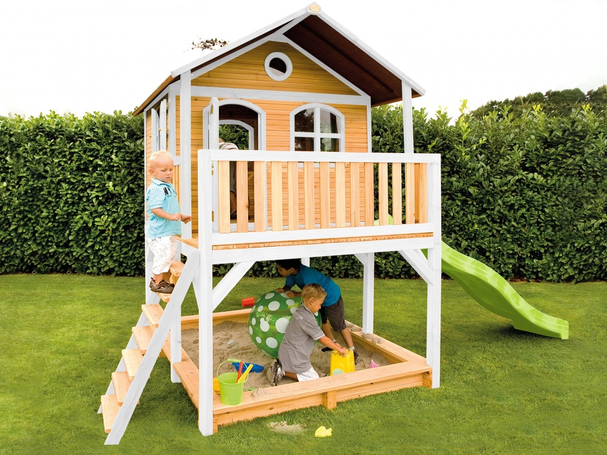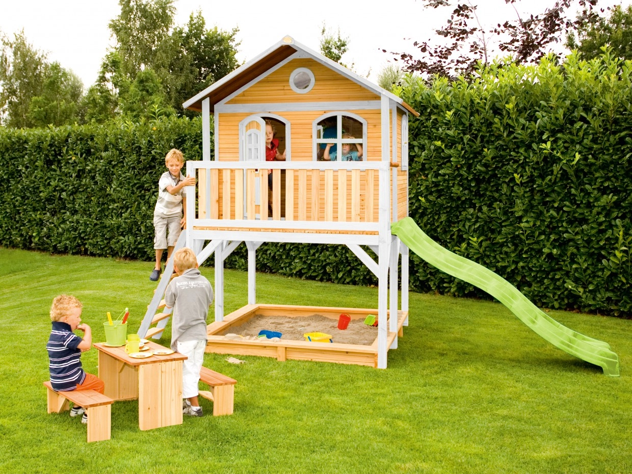 Een van de grootste speelhuizen van hout die je ooit hebt gezien! Als je wilt, kun je hier zelfs in blijven slapen... Zo kun je samen met je vrienden een pyjamafeestje houden in je eigen speelhuis! En overdag kun je natuurlijk samen glijden, klimmen en een fort van zand bouwen in de zandbak onder het huis. Vergeet dan ’s nachts niet de zandbakhoes over de zandbak te doen, zodat de kat van de buren jullie fort niet kan veroveren.