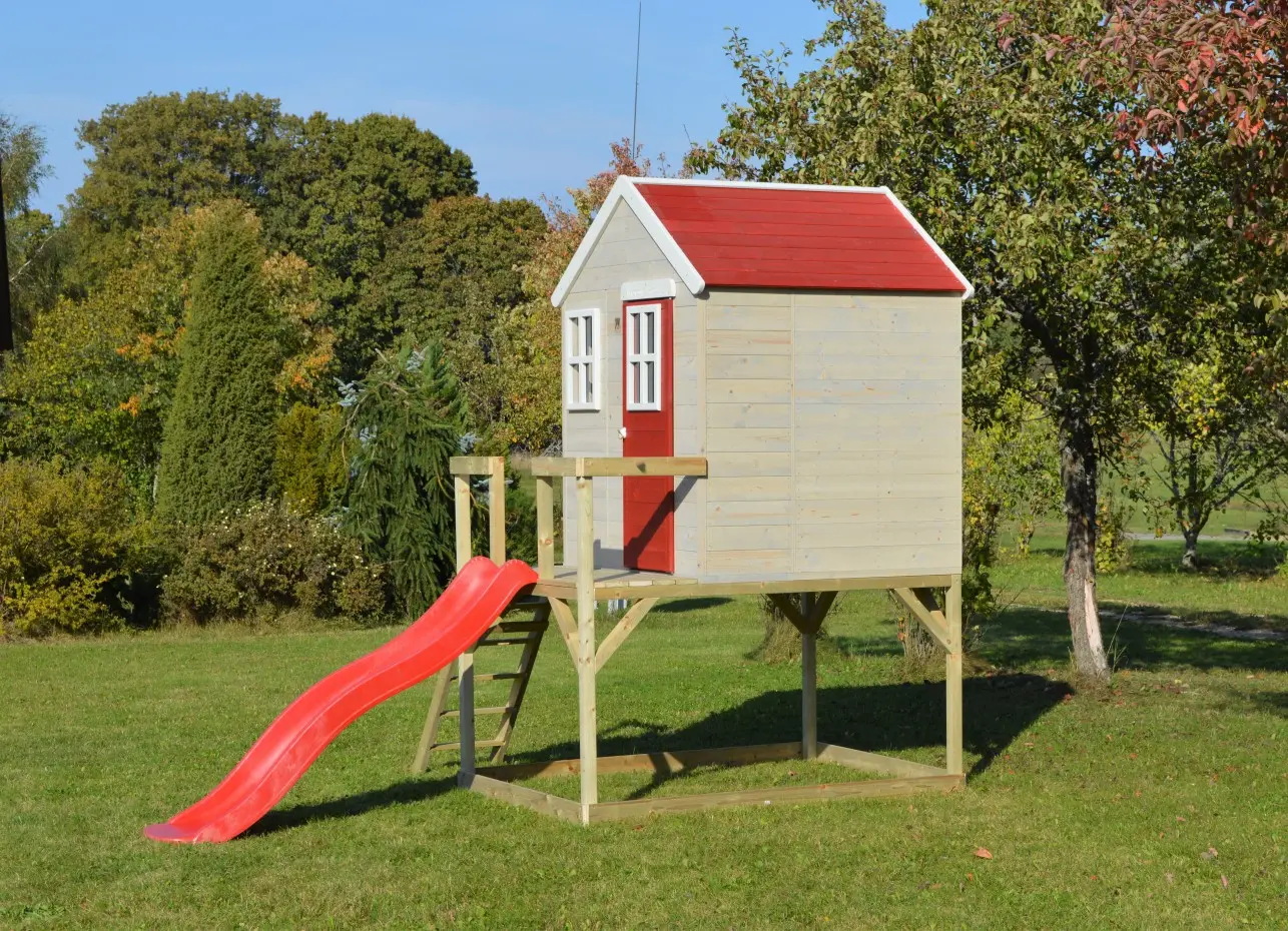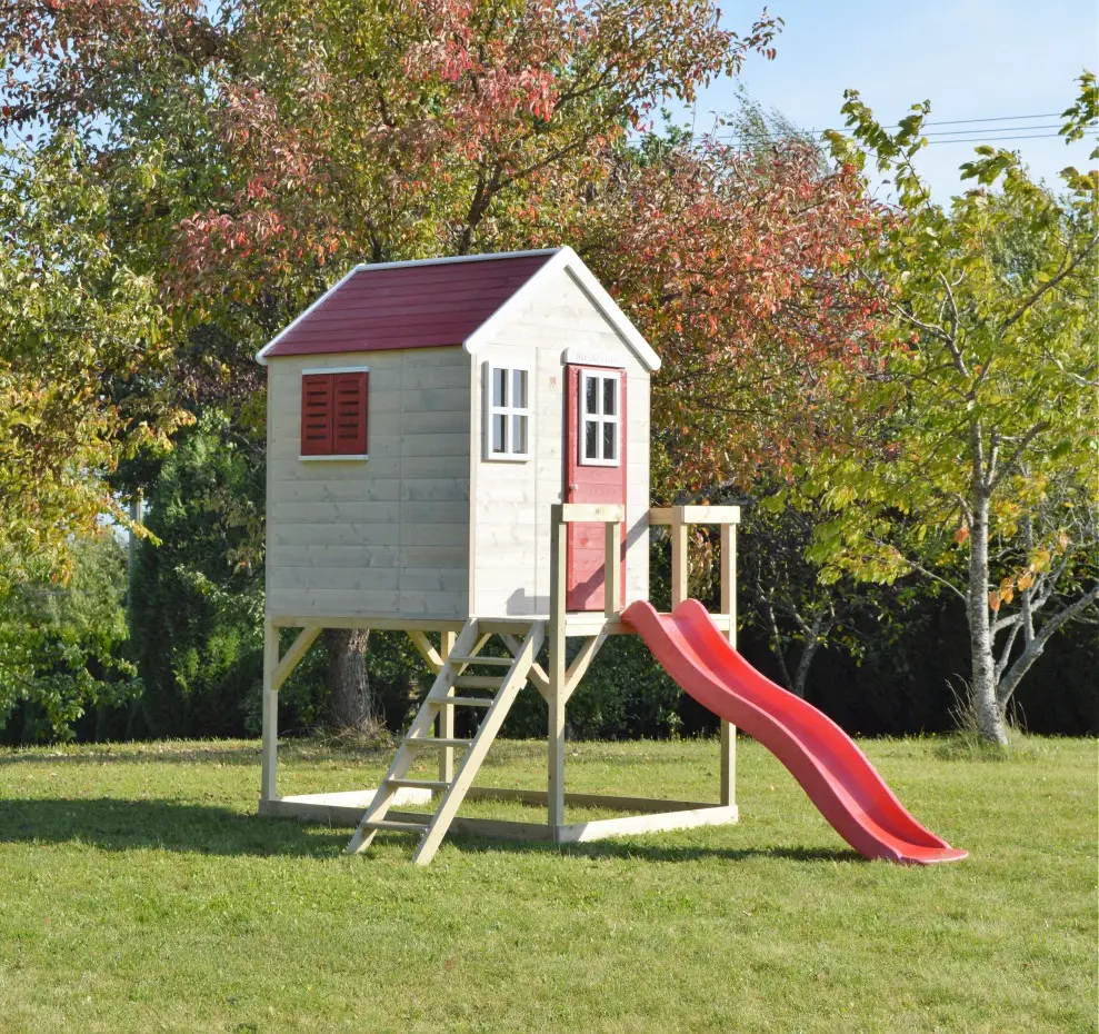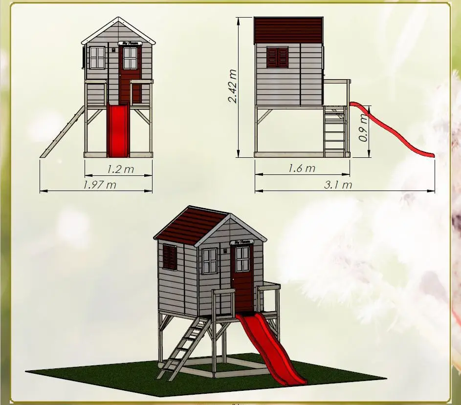 | Uitgerust met | volledige deur, Perspex ramen, luiken, houten plaat met naam "My House", platform, ladder, glijbaan, houten vloer |