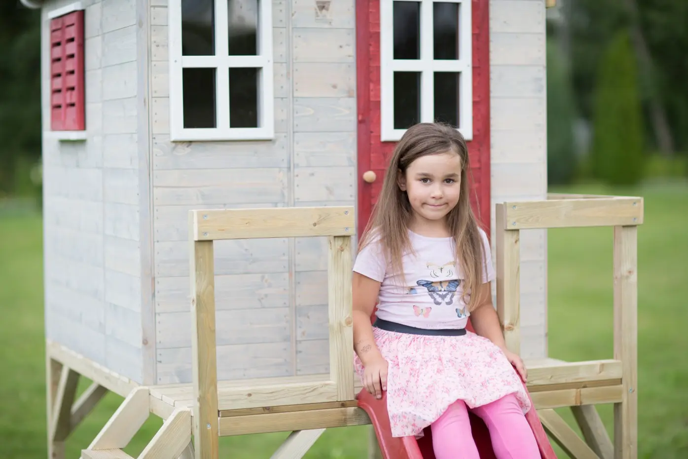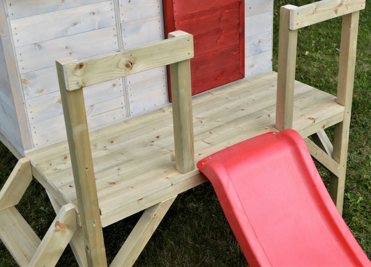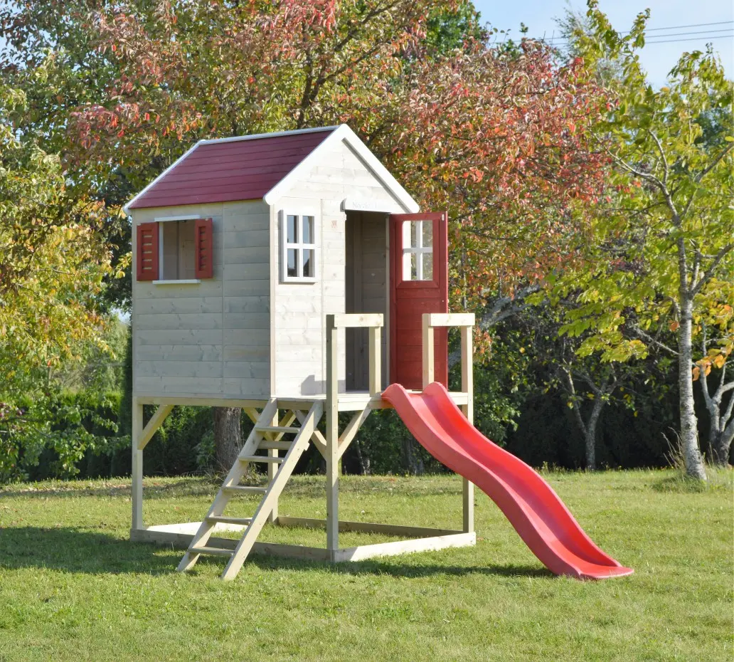 | Uitgerust met | volledige deur, Perspex ramen, luiken, houten plaat met naam "My House", platform, ladder, glijbaan, houten vloer |