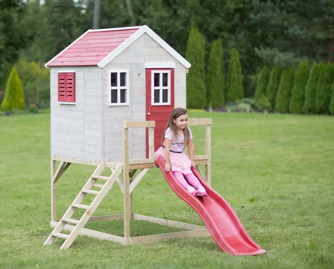 Speelhuis My Lodge met glijbaan; een mooi, modern en stijlvol houten speelhuisje. Perfect voor kinderen om hun eigen wereld te ontdekken in hun eigen tuinhuis. Het speelhuisje biedt perfecte mogelijkheden om buiten te spelen, zelfs in slechte weersomstandigheden. Het houten speelhuisje is geweldig voor kinderactiviteiten, verjaardagsfeestjes in hun eigen tuinhuis. Hiermee kunt u genieten van avonturen en het kan ook worden gebruikt als opslag voor speelgoed en accessoires.