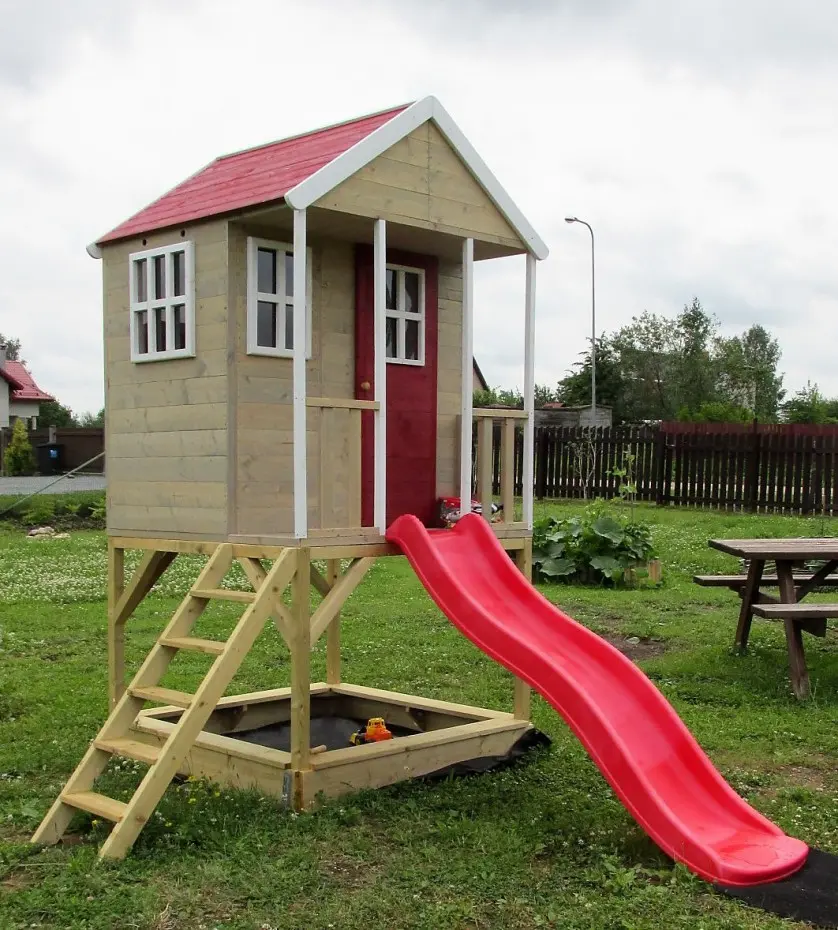 Uitgerust met veranda, zolder, volledige deur, Perspex-ramen, ladder, glijbaan, platform, zandbak, houten vloer