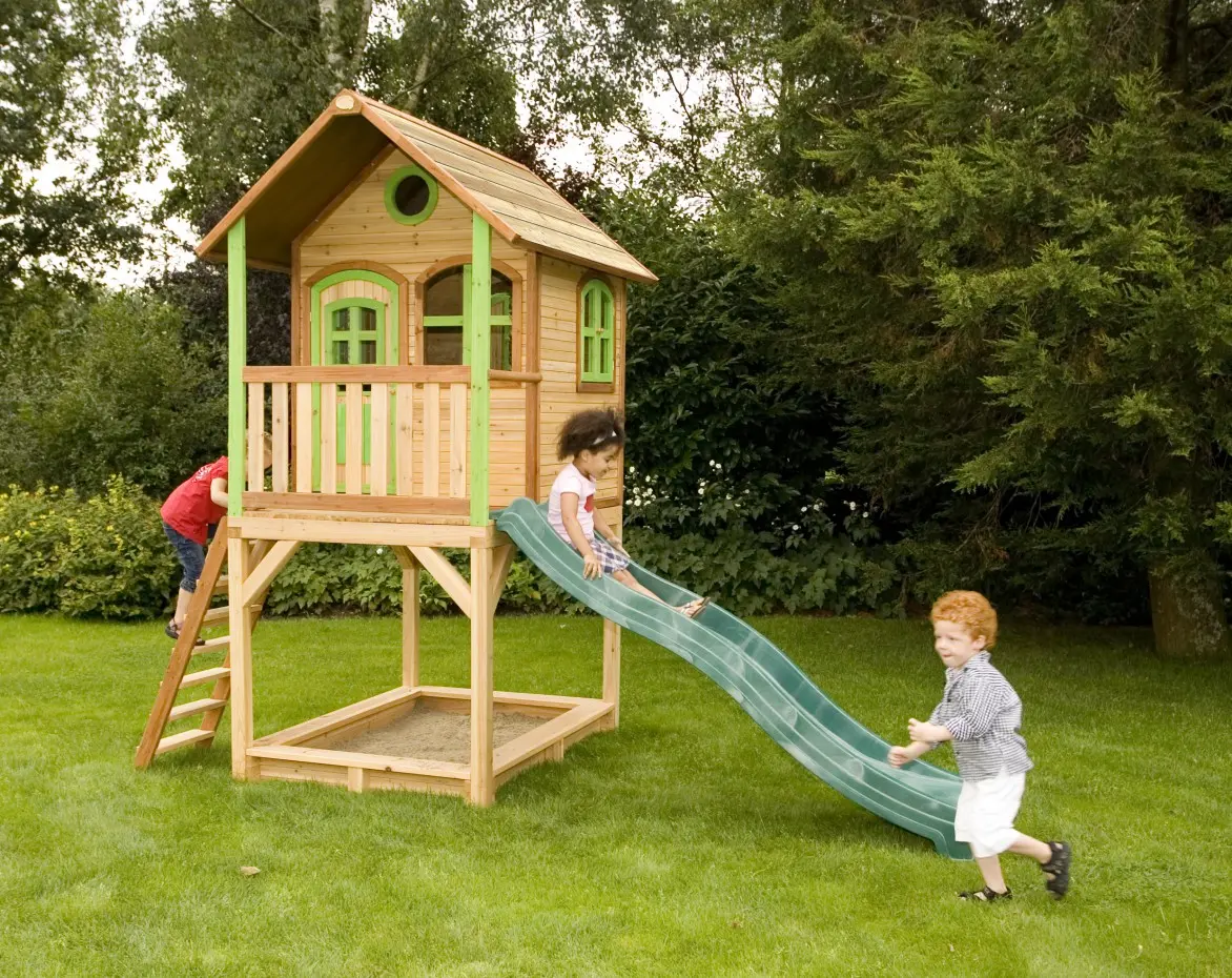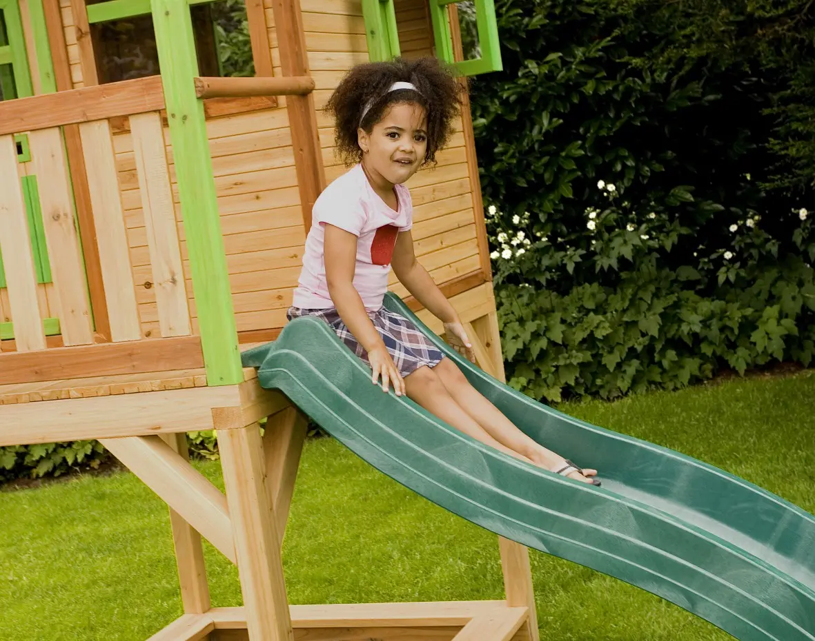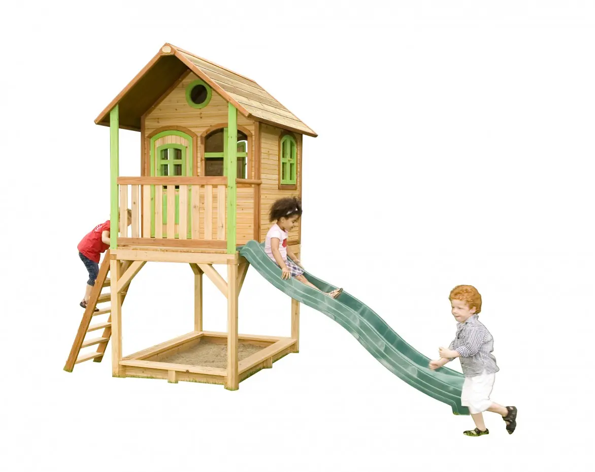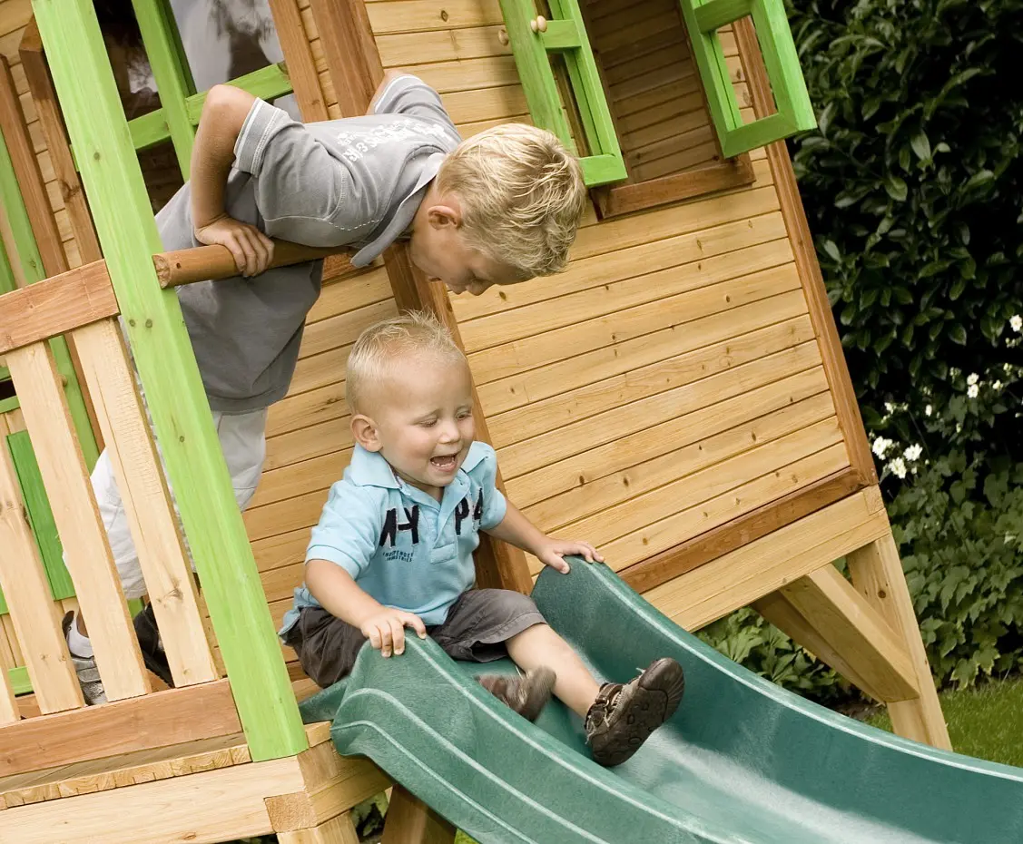 Dit houten speelhuis met glijbaan heeft echt alles wat je je maar wensen kunt! Een trap om in het huisje te klimmen en vervolgens van de lange glijbaan naar beneden te roetsjen. En dan ben je nog niet uitgespeeld, want onder het speelhuis is ook nog een zandbak waar je met z’n allen zandtaartjes kunt bakken.