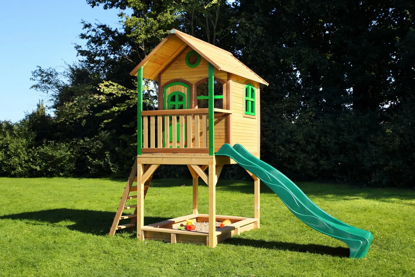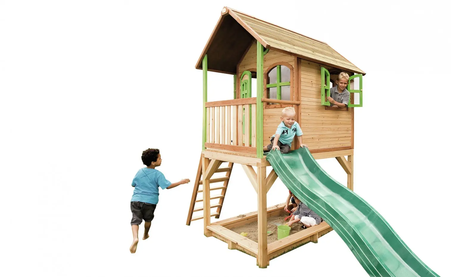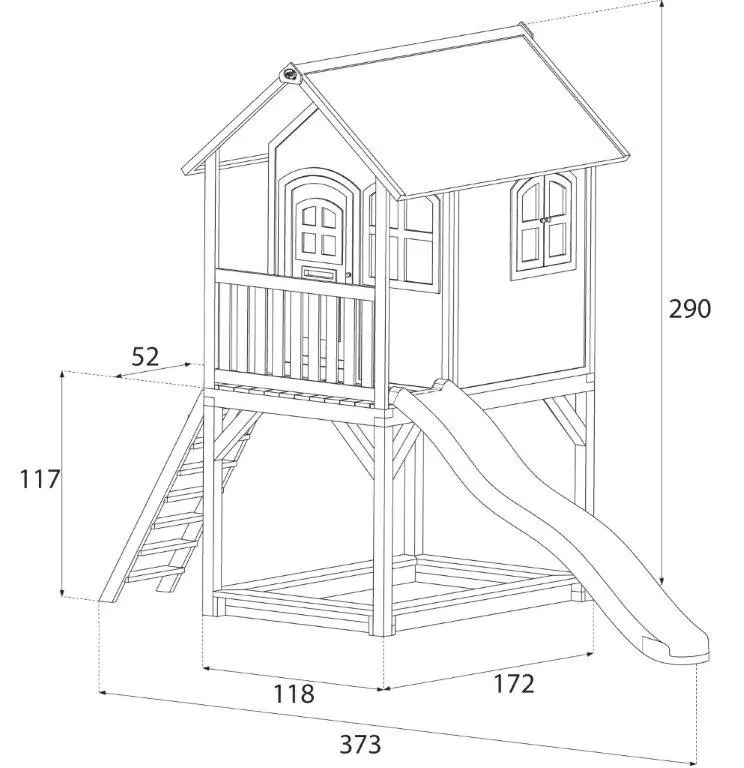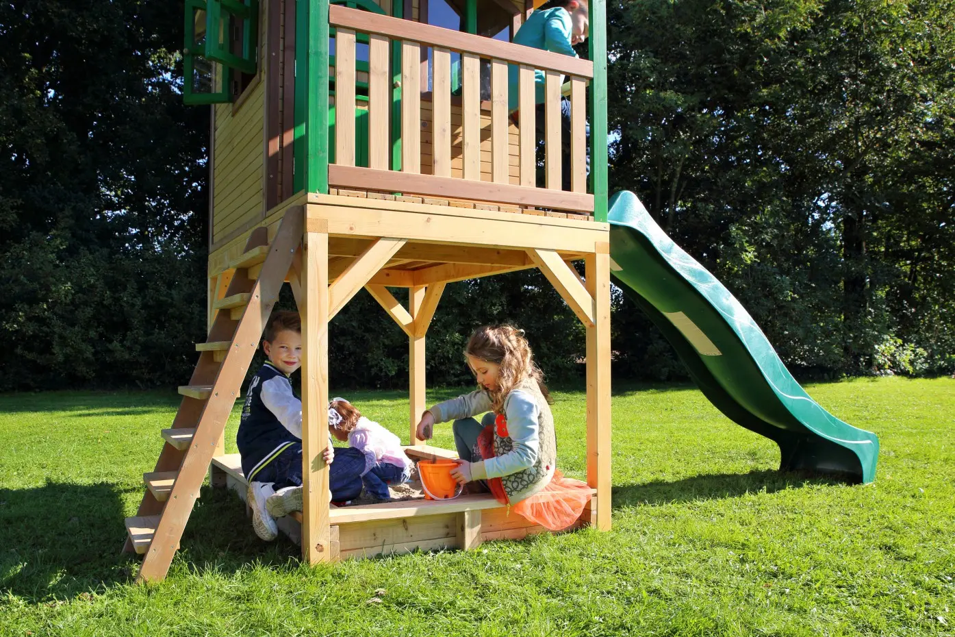 Dit houten speelhuis met glijbaan heeft echt alles wat je je maar wensen kunt! Een trap om in het huisje te klimmen en vervolgens van de lange glijbaan naar beneden te roetsjen. En dan ben je nog niet uitgespeeld, want onder het speelhuis is ook nog een zandbak waar je met z’n allen zandtaartjes kunt bakken.