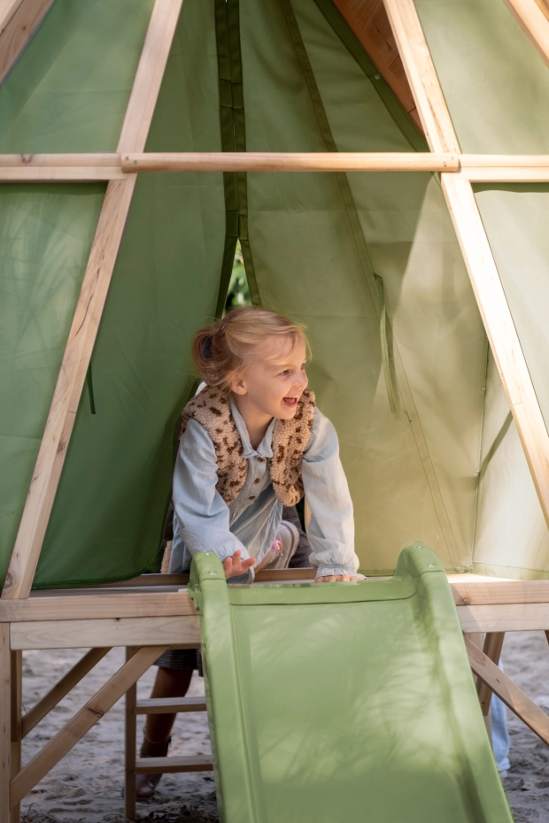 De EXIT Yuki 350 is een speelhuis en speeltent in één, met veranda, glijbaan en houten buitenkeuken. Het stevige FSC®-gecertificeerde hout en het groene doek zorgen voor veiligheid en een knusse glampingsfeer. De EXIT Yuki 350 is duurzaam, weerbestendig en 100% repareerbaar. Met de EXIT Yuki 350 beleven kinderen samen eindeloos buitenplezier.