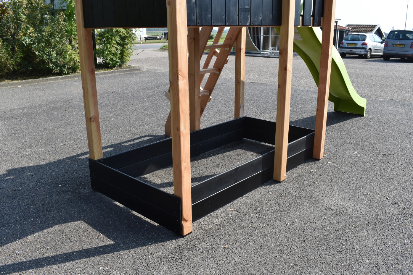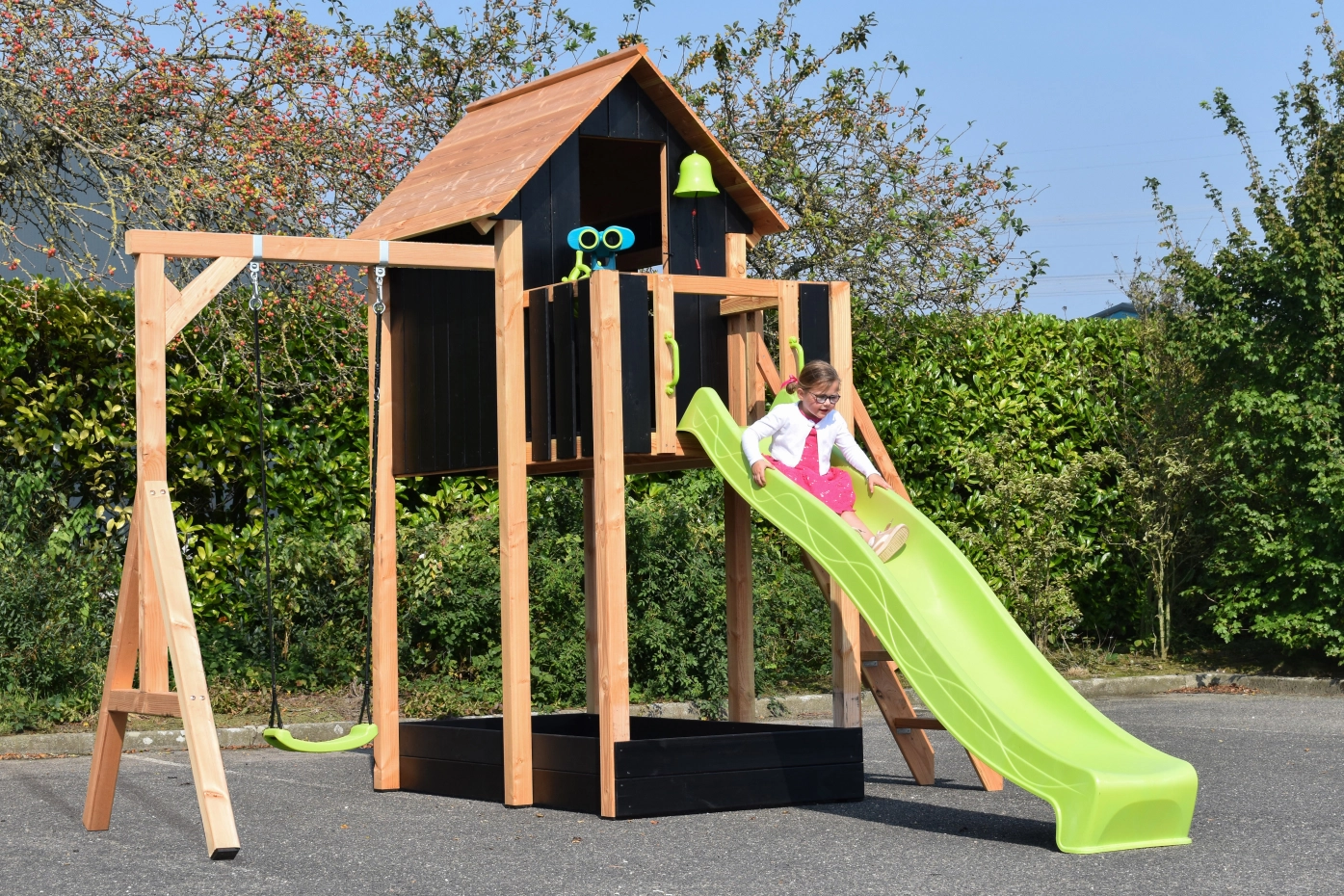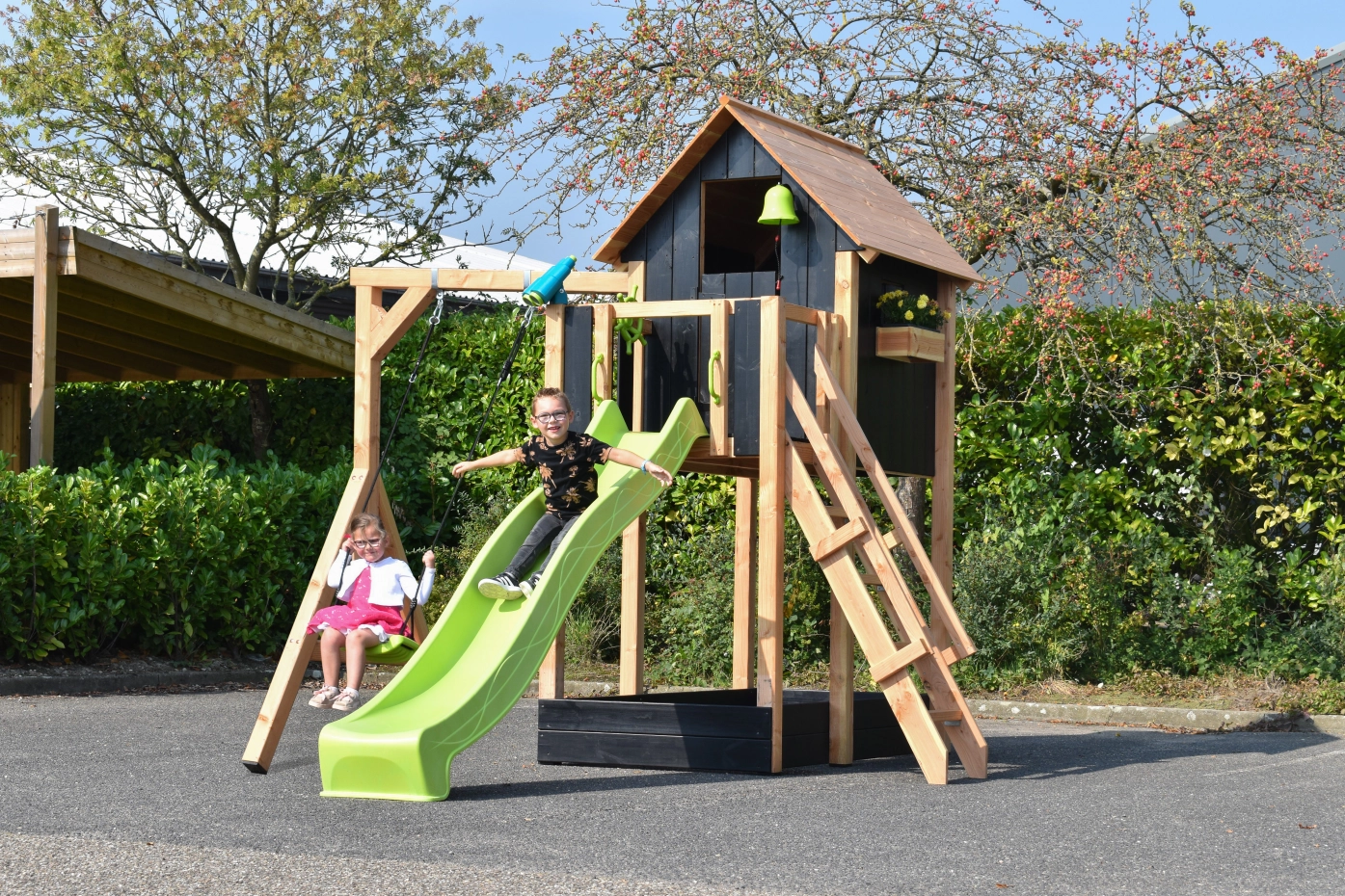Speelhuis Dream 150 met glijbaan en schommel ยท douglas/zwart ยท 391x460x316cm