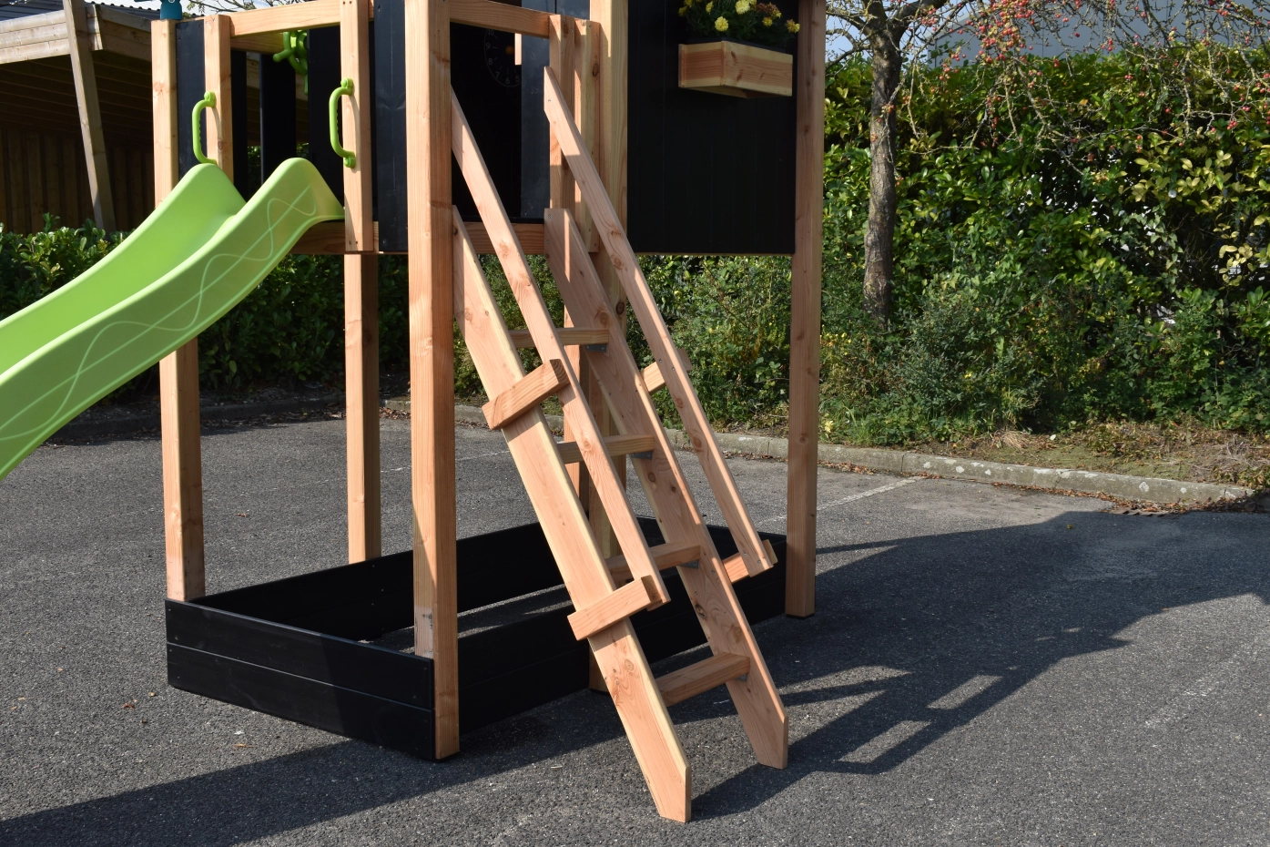 De openingen van de glijbaan en trap zijn zo gemaakt, dat deze eenvoudig van positie te wisselen zijn.