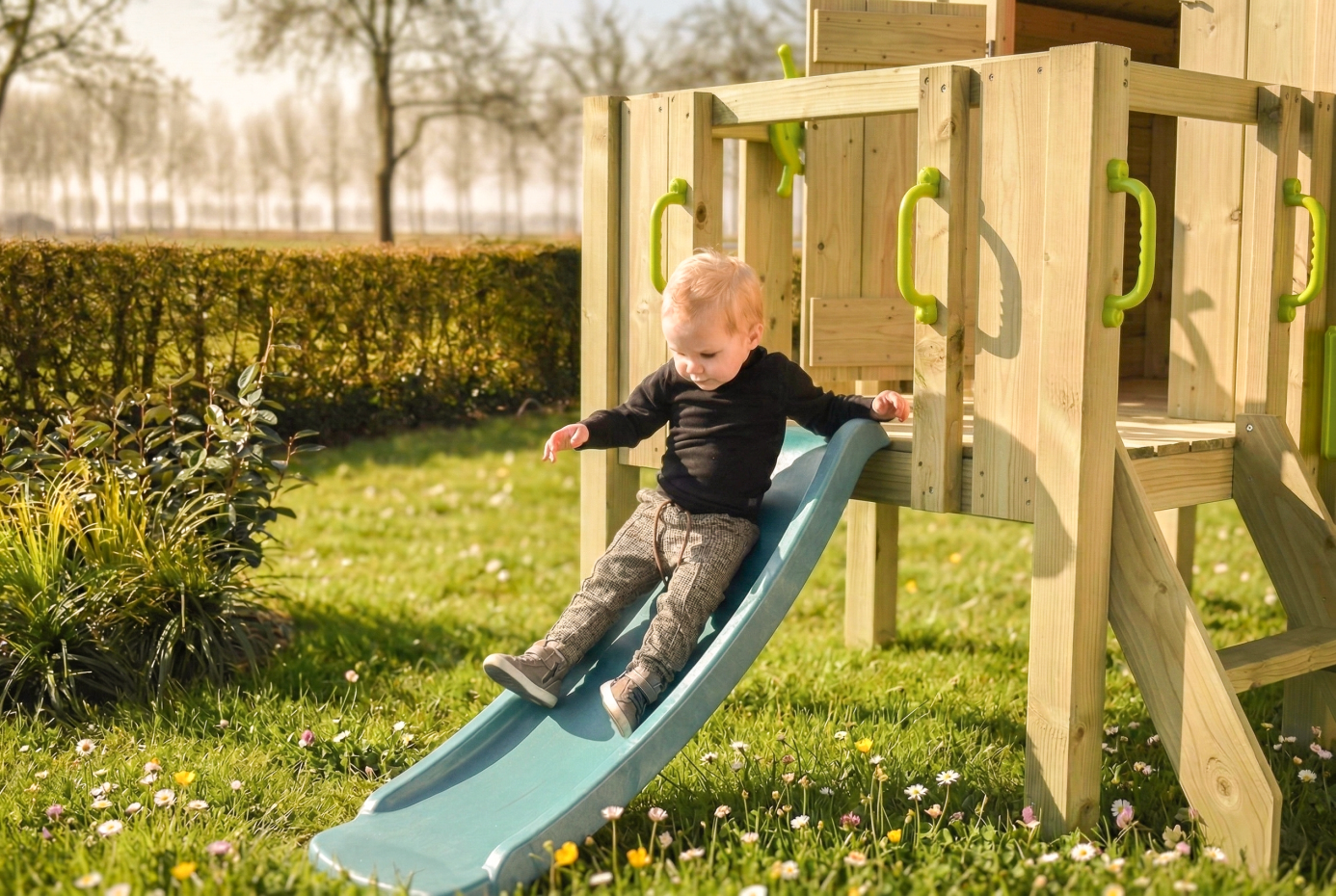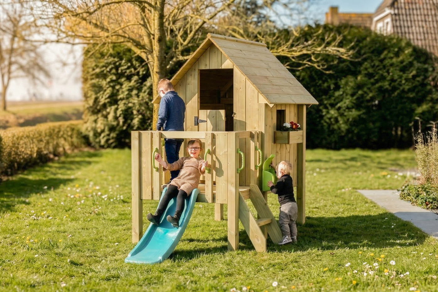 Speelhuis Dream 60 is een knus en stevig speelhuisje met een platformhoogte van 60 cm – laag bij de grond, maar toch met een leuke glijbaan voor veel speelplezier. Het huisje heeft een klassiek puntdak dat zorgt voor een gezellige, tijdloze uitstraling.