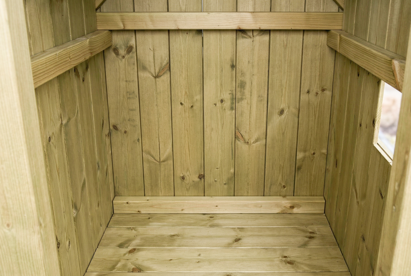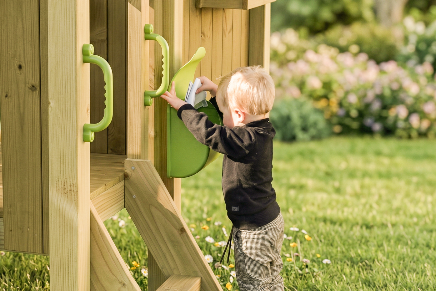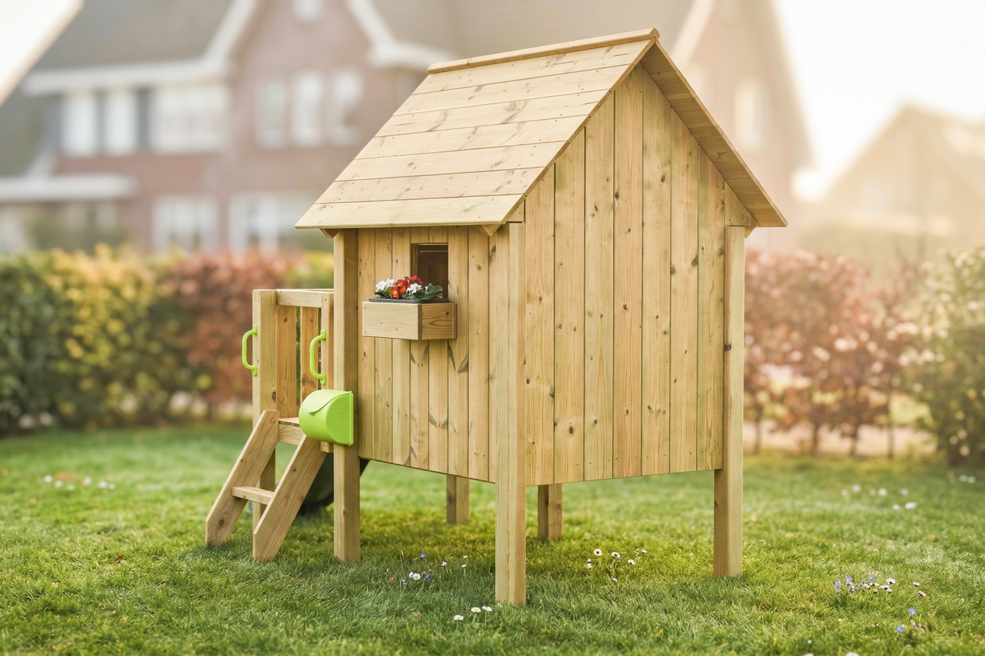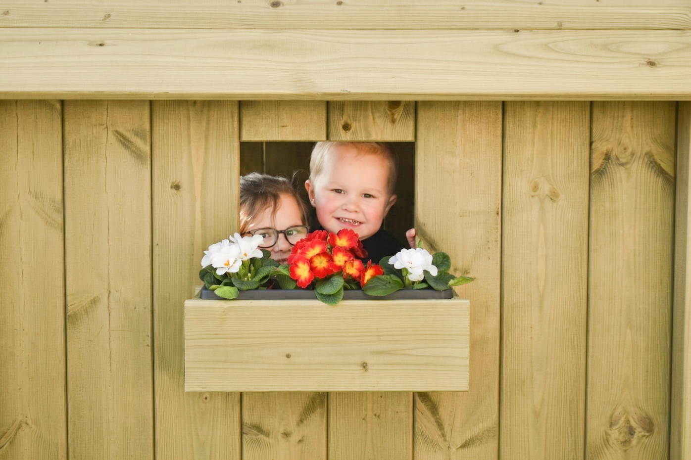 Aan de zijkant zit een leuk bloembakje bij het raam, perfect om samen bloemetjes of plantjes in te zetten. Binnenkomen doe je via het speelse deurtje, en dankzij de reling rondom het platform is het veilig om te spelen. Een heerlijk huisje voor eindeloze buitendagen vol fantasie en plezier!