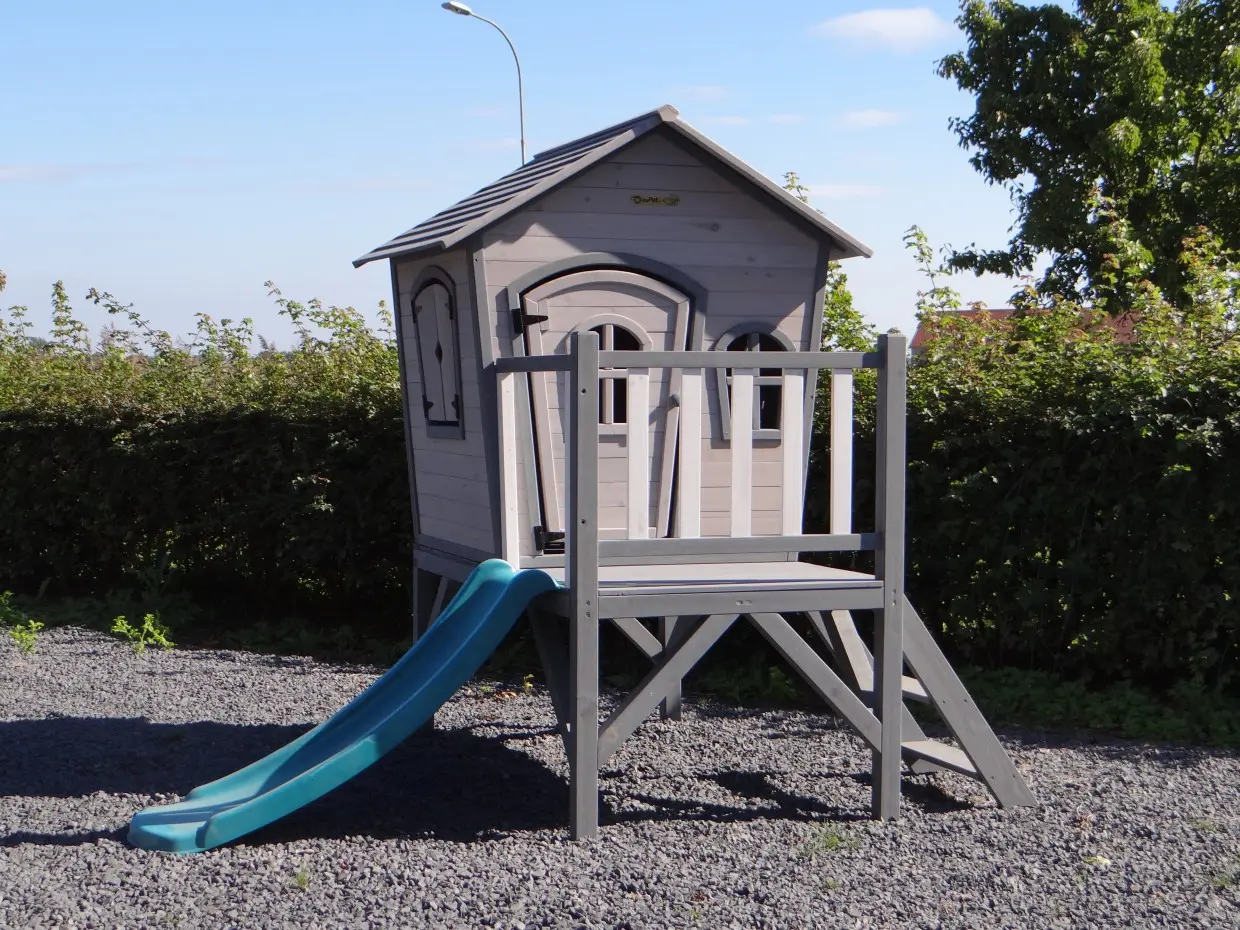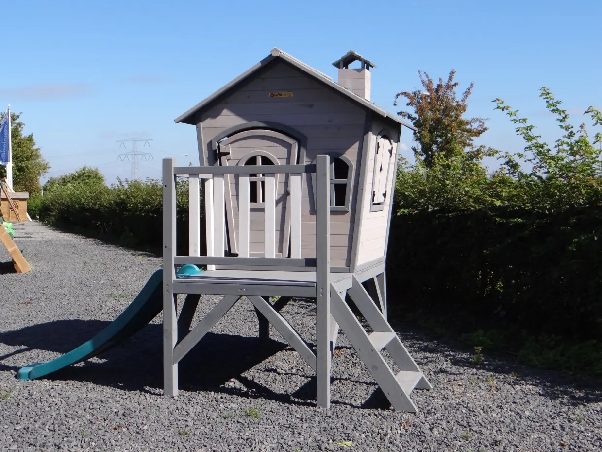 Speelhuisje Jasmine met glijbaan is een modern speelhuisje in frisse grijze kleurstelling. Het speelhuisje met glijbaan staat op een plateau van 60cm hoog. Klim snel via het trapje omhoog en glij zo weer naar beneden! Het houten speelhuisje is voorzien van een 2 scheve wanden, schoorsteen, deuropening en 2 luikjes die allebei open kunnen.
