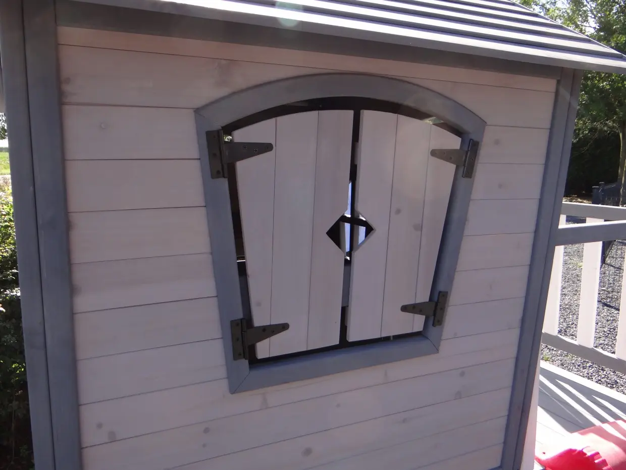 - Het speelhuis is eenmaal licht gebeitst om het op kleur te brengen