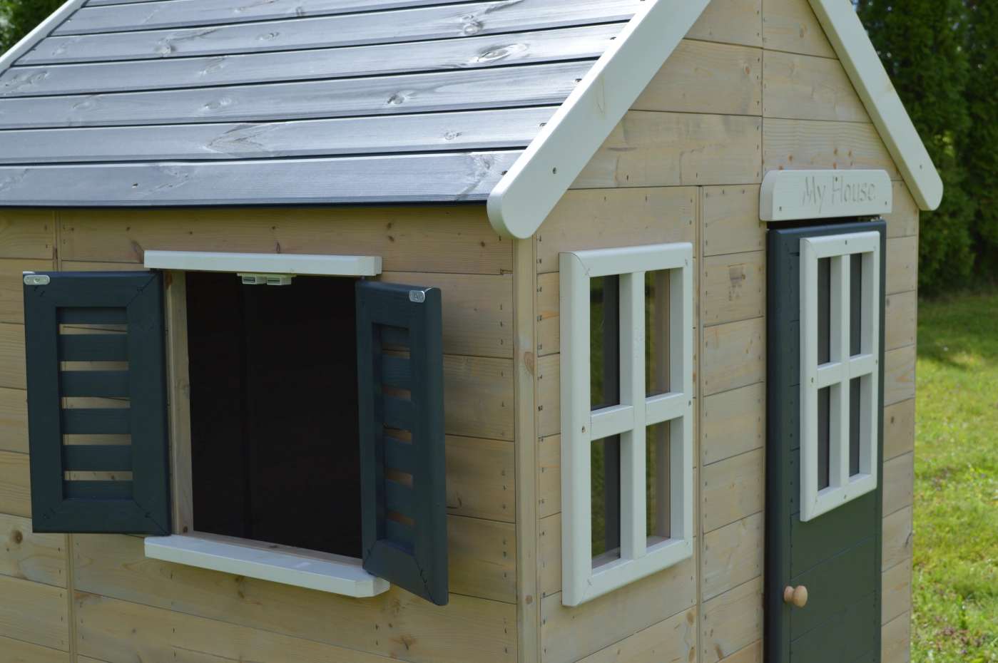 Speelhuisje My Lodge Grey; een mooi, modern en stijlvol houten speelhuisje. Perfect voor kinderen om hun eigen wereld te ontdekken in hun eigen tuinhuis. Het speelhuisje biedt perfecte mogelijkheden om buiten te spelen, zelfs in slechte weersomstandigheden. Het houten speelhuisje is geweldig voor kinderactiviteiten, verjaardagsfeestjes in hun eigen tuinhuis. Hiermee kunt u genieten van avonturen en het kan ook worden gebruikt als opslag voor speelgoed en accessoires.