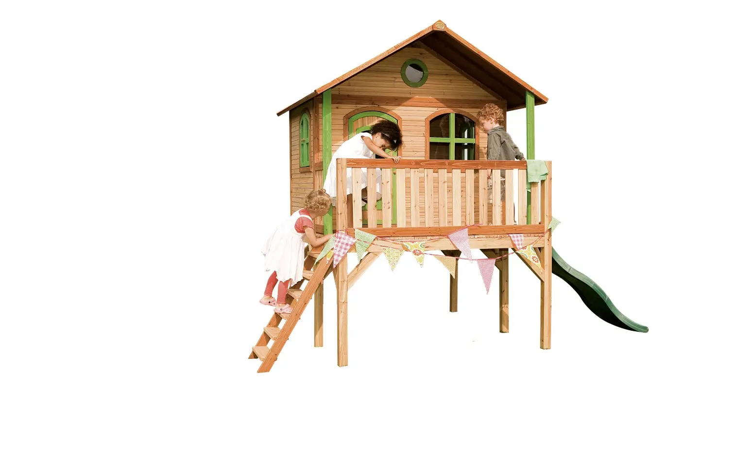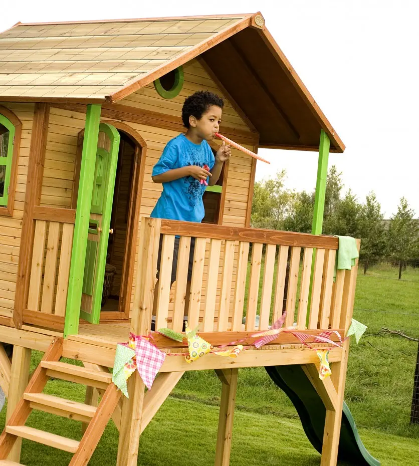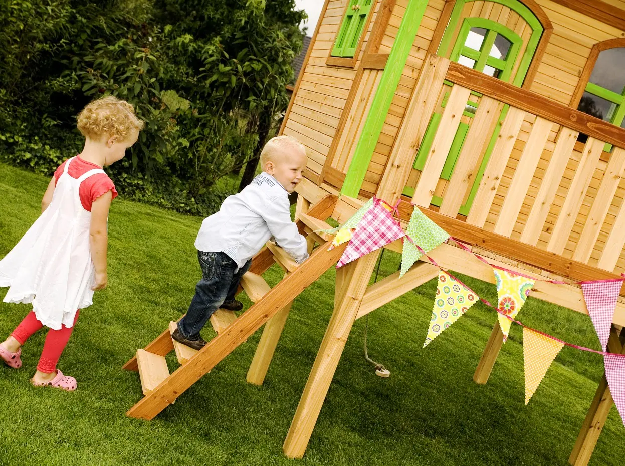 - De dikte van het hout; wanden van 15 mm en lijsten van 38 mm, maakt het speelhuis stevig en robuust, zodat het tegen een speelstootje kan.