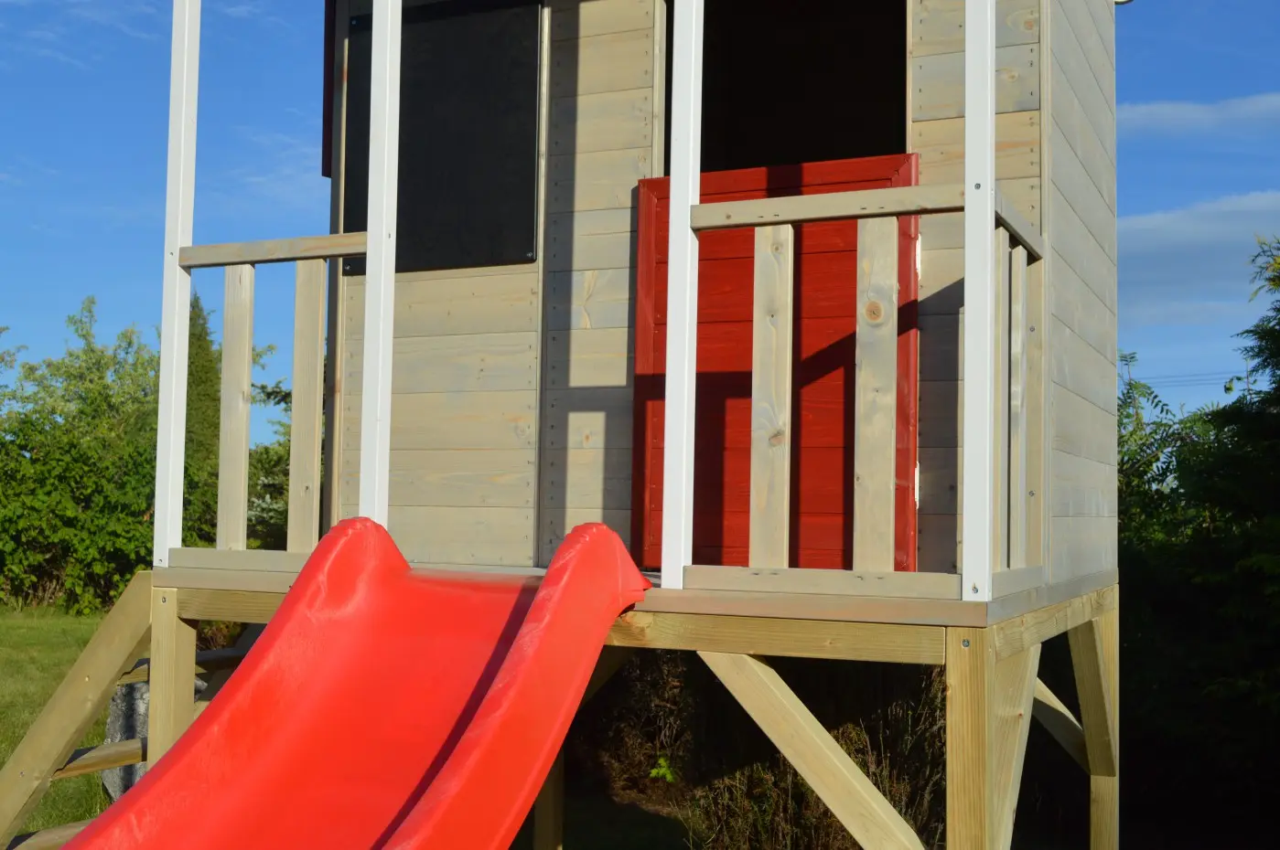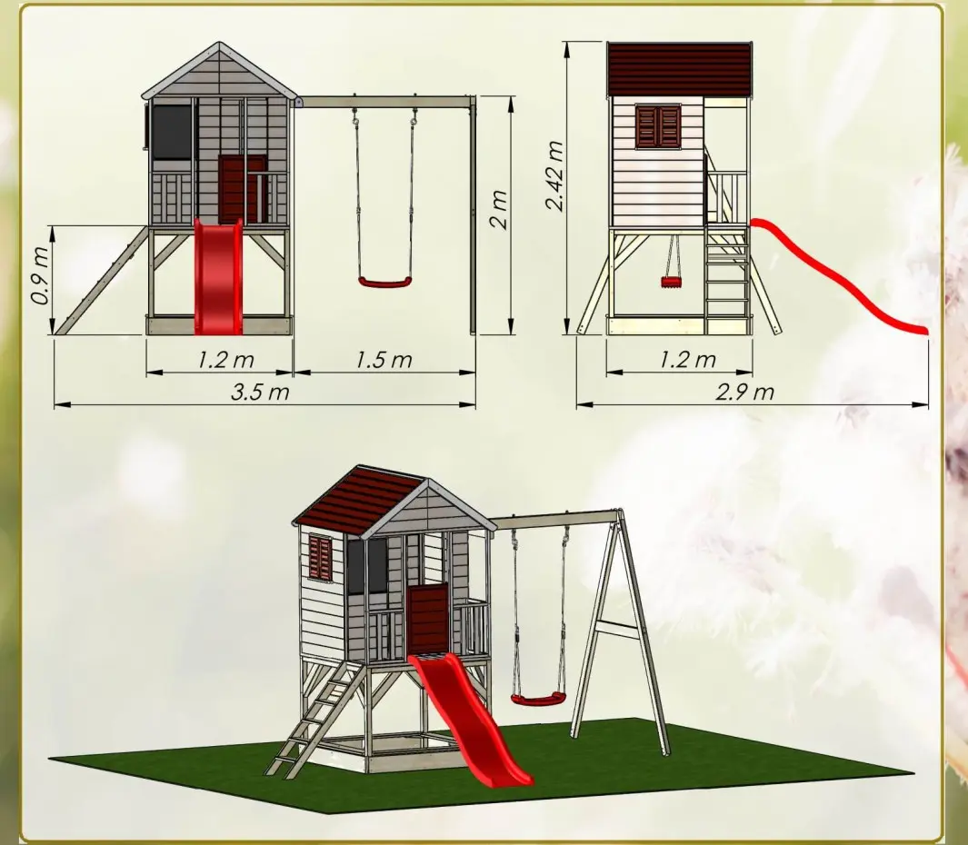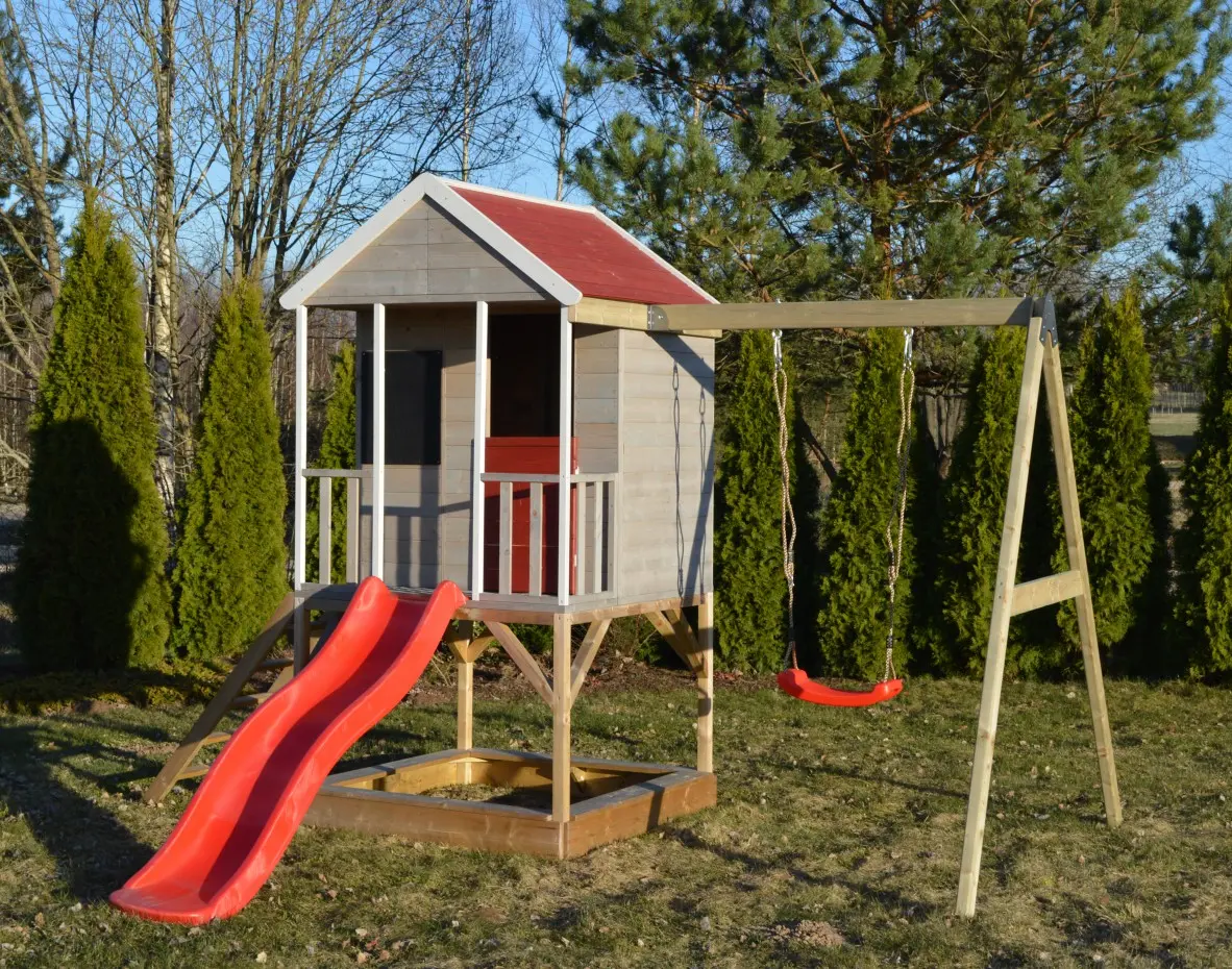 | Uitgerust met | veranda, zolder, halve deur, luiken, krijtbord, ladder, glijbaan, platform, zandbak, enkele schommel met zitje, 4 grondankers, houten vloer |