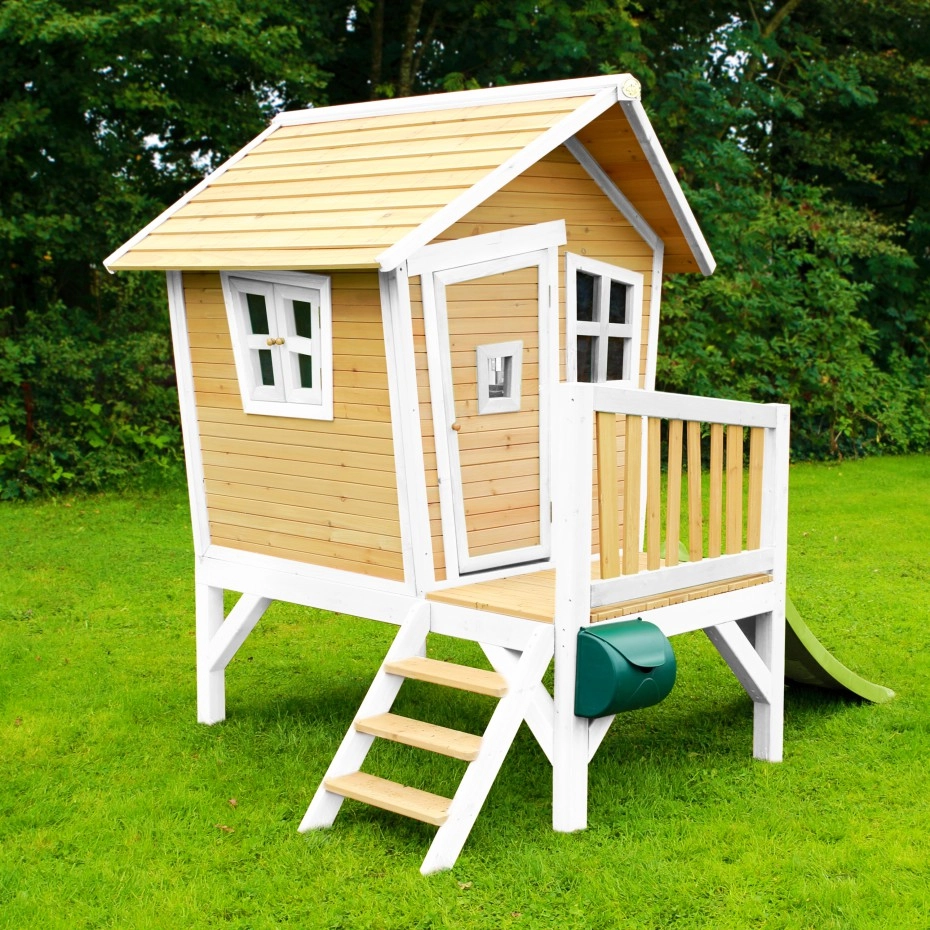 Speelhuisje Robin wit/bruin met glijbaan, daar speel je samen met je vrienden Robin Hood of het verhaal van Doornroosje. Klim de trap op naar het zolderkamertje en kus Doornroosje wakker... In dit speelhuisje van hout met scheve deuren en ramen wordt elk sprookje werkelijkheid.