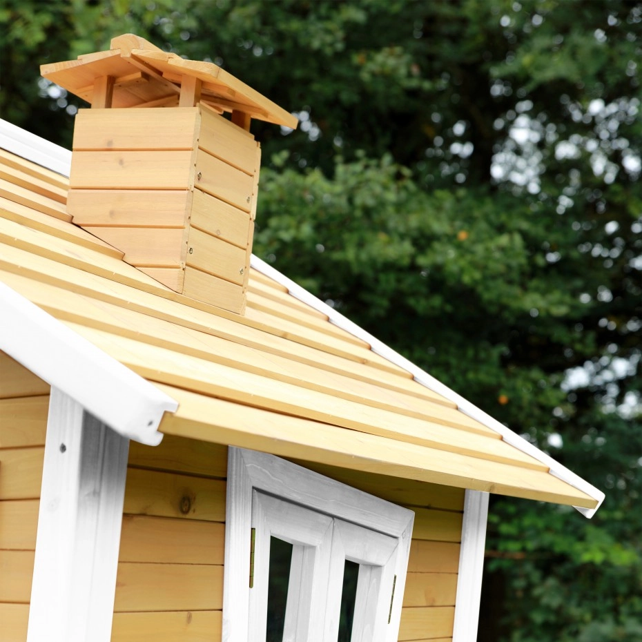 - De dikte van het hout; wanden van 15 mm en lijsten van 38 mm, maakt het speelhuis stevig en robuust, zodat het tegen een speelstootje kan.