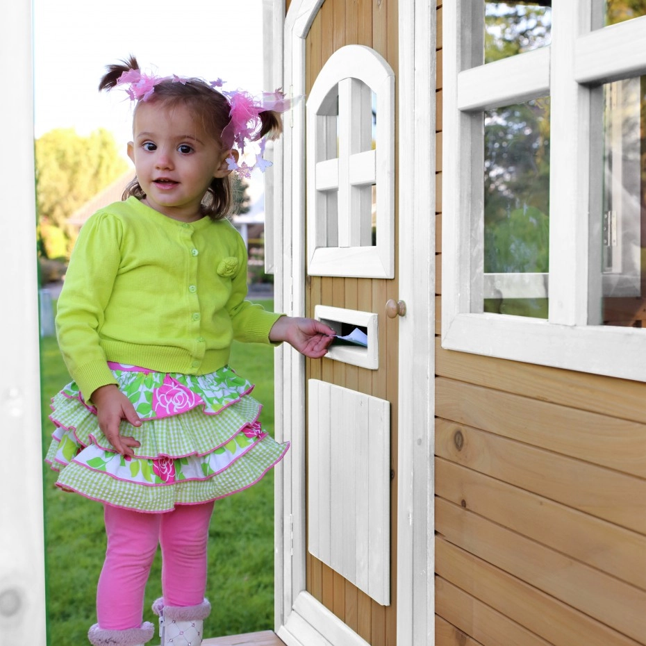 Kinderen vinden het heerlijk om met vriendjes of vriendinnetjes in het houten Tom Speelhuis Bruin/wit van AXI te spelen. Klimmen op de trap, over de veranda en snel weer naar beneden van de glijbaan. Hoe vaker ze naar beneden glijden, hoe leuker ze het vinden! In dit speelhuis kunnen ze elkaar de mooiste geheimen vertellen. Zodra ze de ramen en deur dicht doen, kan niemand ze meer afluisteren! Tom is een veelzijdig houten speelhuis met een halfronde deur en ramen. De deur heeft een brievenbus waar kinderen post doorheen kunnen gooien als ze postbodetje spelen. Het speelhuisje is uitgevoerd in moderne bruin/witte kleuren welke perfect in iedere hedendaagse tuin passen. Tom speelhuis heeft een platformhoogte van 58 cm en is uitgevoerd met een kleine glijbaan van 118 cm lang. Het trapje en glijbaan kunnen zowel links als rechts aan het speelhuis worden bevestigd.