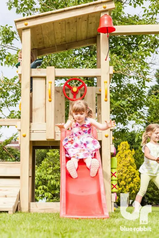 Speeltoren Cascade van Blue Rabbit is een prachtige speeltoren die de kinderen direct leuk zullen vinden door zijn charmante uitstraling. Speeltoren Cascade Extra Laag heeft een speelplateau van 90cm en één van 60cm. Kinderen van alle leeftijden kunnen makkelijk op de speeltoren komen door de schuine, houten helling. Om de speeltoren nog leuker te maken kan er aan de rechterkant een aanbouwschommel @swing geplaatst worden.