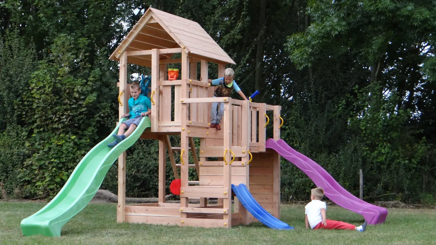 Speeltoestel Penthouse Douglas met twee glijbanen is een grote speeltoren voor gigantisch veel speelplezier! (De derde glijbaan voor plateau 120cm is optioneel).