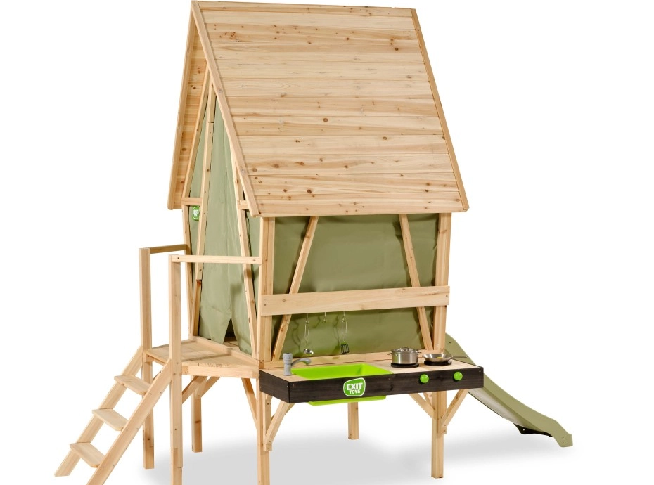 De EXIT Yuki 350 is een speelhuis en speeltent in één, met veranda, glijbaan en houten buitenkeuken. Het stevige FSC®-gecertificeerde hout en het groene doek zorgen voor veiligheid en een knusse glampingsfeer. De EXIT Yuki 350 is duurzaam, weerbestendig en 100% repareerbaar. Met de EXIT Yuki 350 beleven kinderen samen eindeloos buitenplezier.