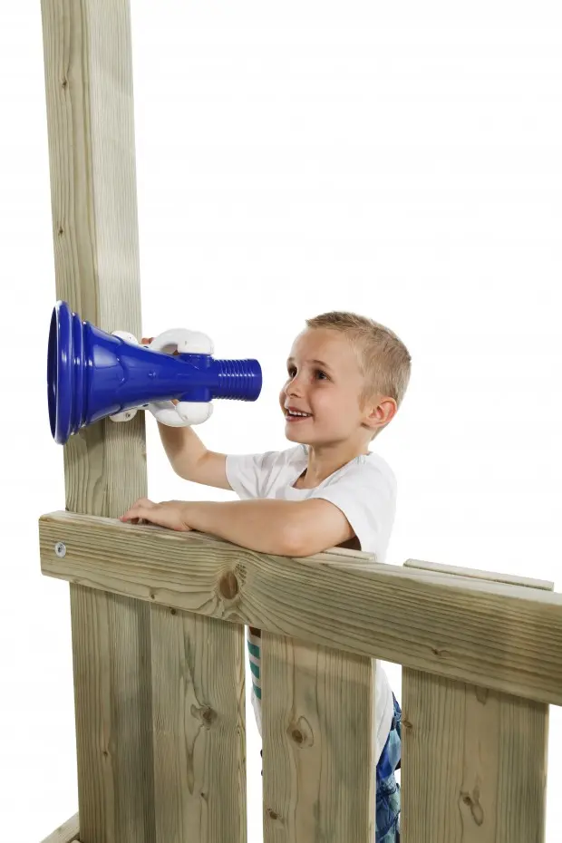 De megafoon blauw/wit voor aan het speeltoestel. Dit product is een leuke aanvulling op uw speeltoestel. De megafoon beschikt over verschillende geluiden. De megafoon is eenvoudig te monteren. De megafoon werkt op AA-batterijen.