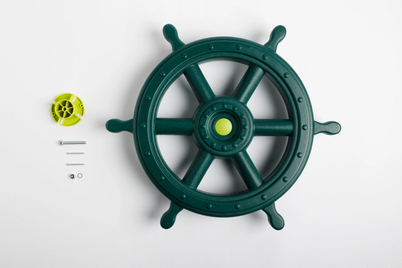 Een groot stuurwiel met een afmeting van Ø54cm. Dit donkergroene piratenstuur XXL is een leuke uitbreiding voor aan het speeltoestel. Het speelgoed stuur wordt geleverd inclusief bevestigingsmateriaal en is gemakkelijk te monteren.