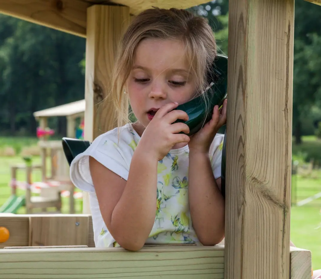 Deze groene telefoon is een leuke accessoire voor het speeltoestel! Het indrukken van de toetsen van deze telefoon geeft een echt rinkelgeluid. De telefoon wordt geleverd inclusief bevestigingsmateriaal en is eenvoudig te monteren.