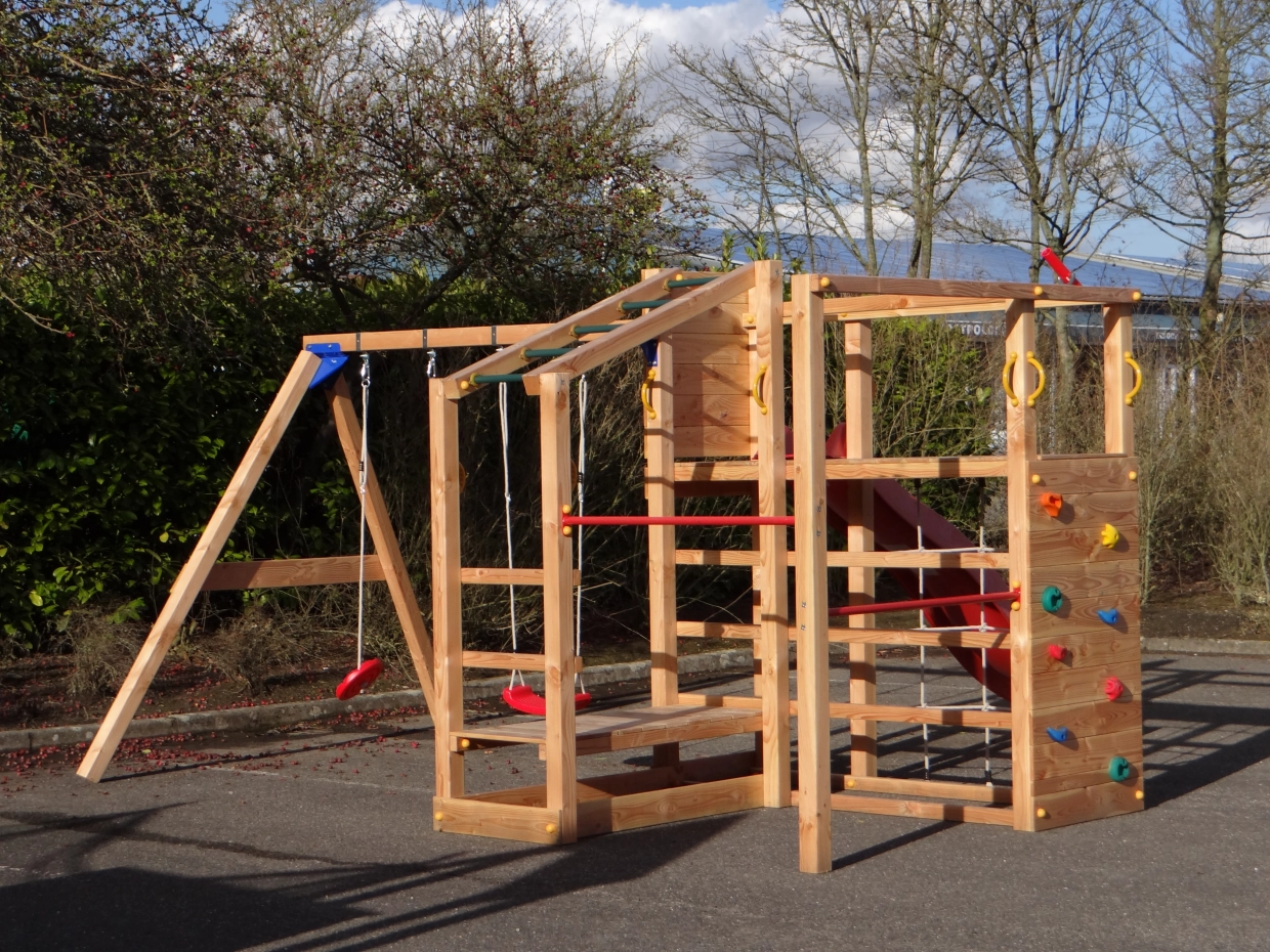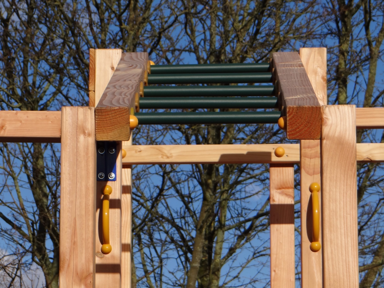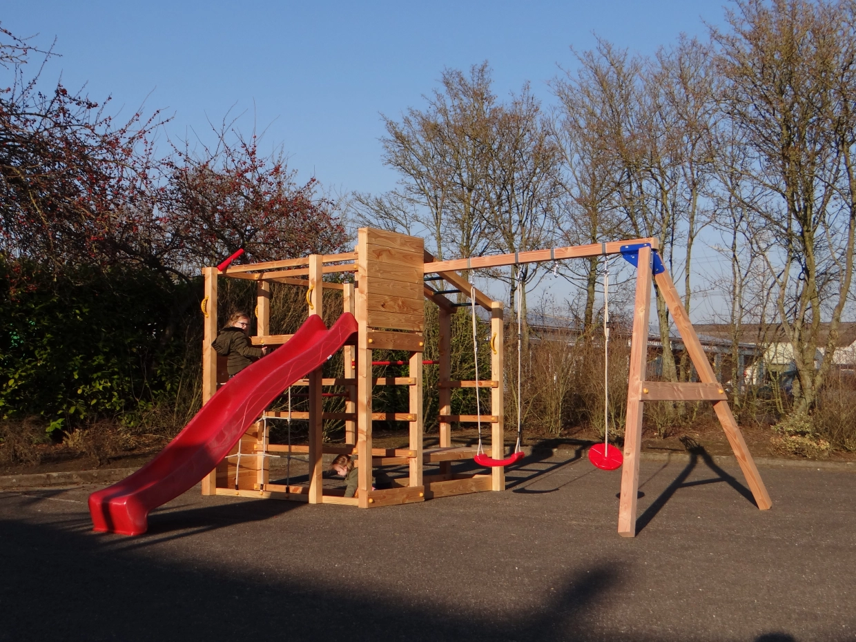 Het klimtoestel is uitgerust met een klimnet, een apenbrug en een klimmuur met kleurrijke klimstenen, twee metalen duikelrekken en klimrekken. Aanbouwschommel @Swing biedt een extra stukje uitdaging voor de kinderen. Aan de @Swing kunnen allerlei accessoires gehangen worden: boksbal, turnringen, touwladder of een schommelzitje. Deze kunnen gemakkelijk mee besteld worden.