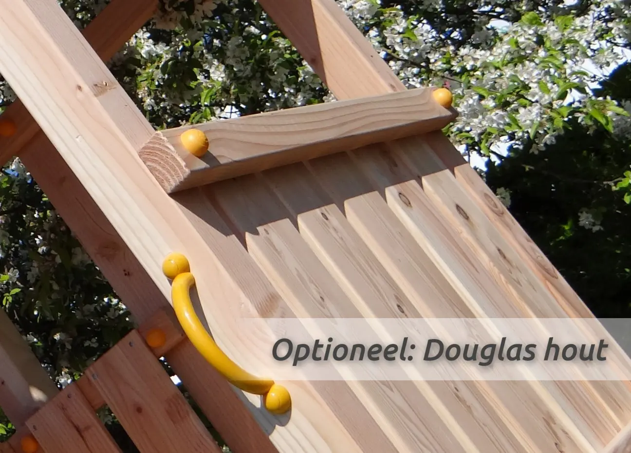 - Exclusief zandbakdeksel. Dit speeltoestel heeft aan de onderzijde een opstaande plank. Er kan een extra plank en zandbakdeksel mee besteld worden, zodat u een afgesloten zandbak onder het speeltoestel kunt maken.