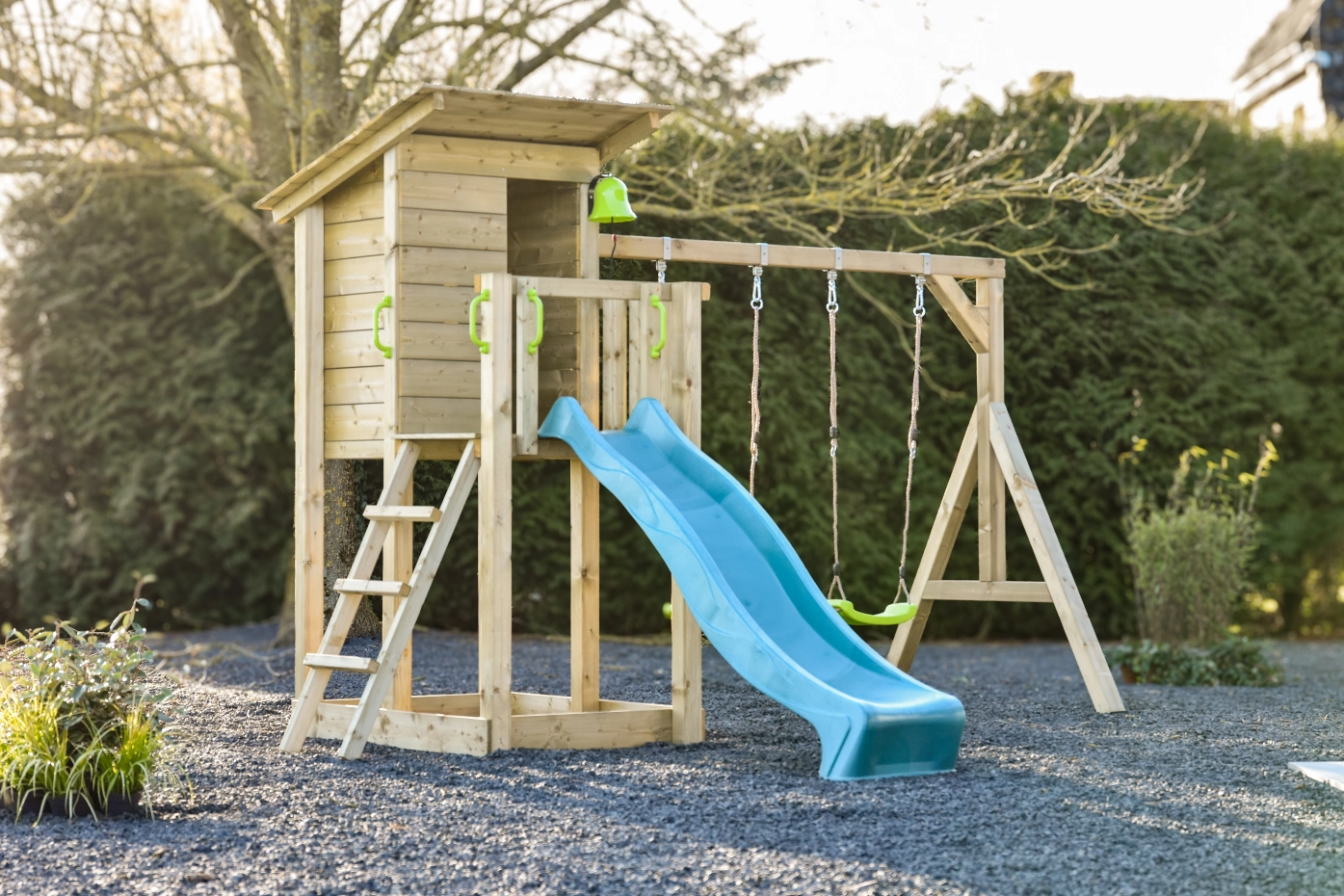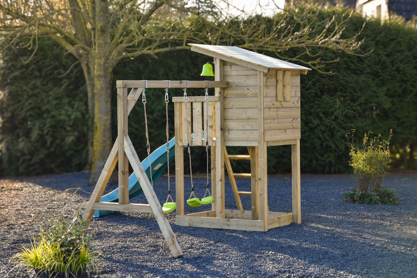 Het is mogelijk om de trap en de glijbaan, links, rechts of aan de voorkant te plaatsen. De schommel kan links en rechts bevestigd worden, door deze mogelijkheden past hij op elke plek in uw tuin!
