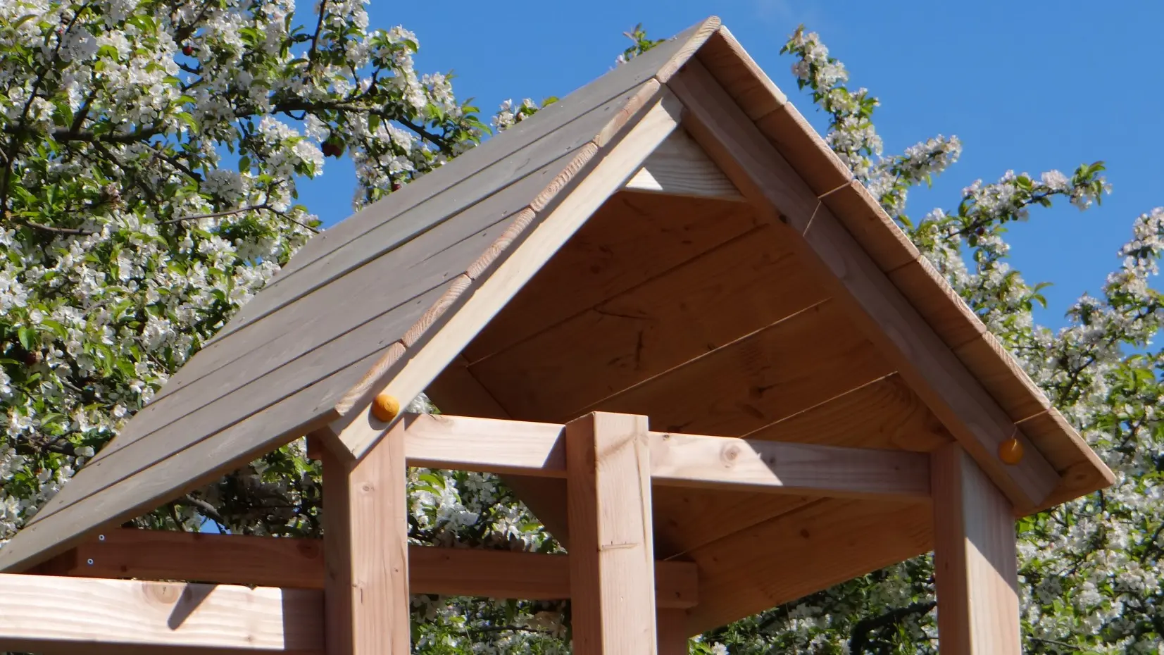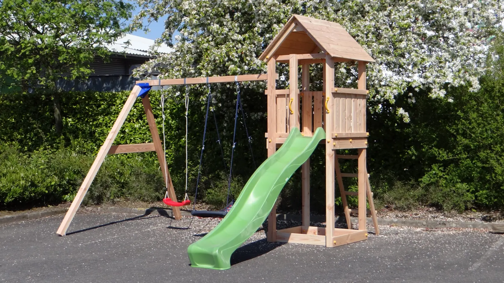 Speeltoestel Kiosk van Douglas hout met glijbaan en schommel-aanbouw is een prachtige en duurzame speeltoren die compact neergezet kan worden en perfect past in de tuin van nu! Het duurzame Douglas-hout wordt steeds vaker gebruikt in de tuin. Het heeft mooie, vlammende nerven en blijft onbehandeld makkelijk 10-15 jaar goed in ons klimaat. Wel vergrijst het erg snel door de zon. U kunt het hiertegen beschermen met beits of Douglas-olie.