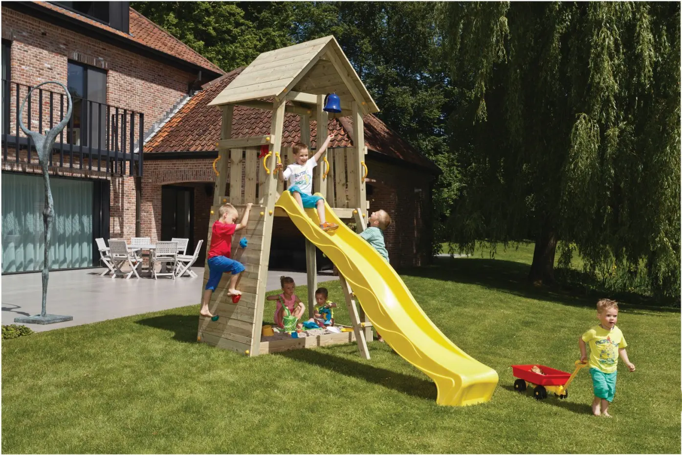 Geniet van weidse uitzichten op deze Belvedere Speeltoren! Deze Speeltoren is zeer geschikt voor de kleinere tuinen doordat zowel de glijbaan als de ladder zich aan de voorzijde bevinden. De hellende zijwanden en de geïntegreerde brede klimwand zorgen voor het bijzondere uiterlijk van deze Speeltoren. Deze speeltoren heeft een plateauhoogte van 150 cm.