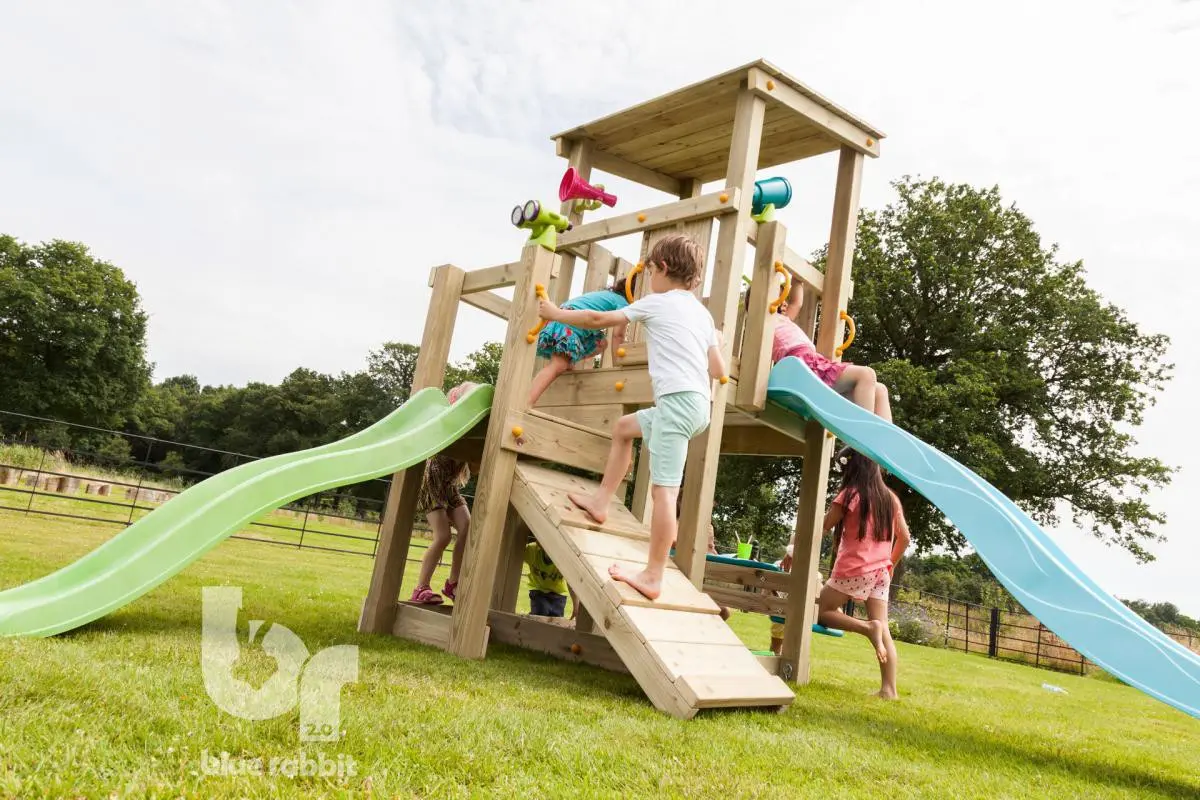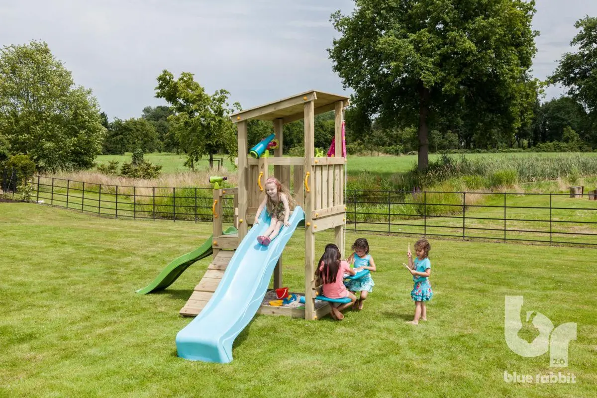 De Blue Rabbit Cascade is een prachtige speeltoren die de kinderen direct leuk zullen vinden door zijn charmante uitstraling. De speeltoren heeft een platformhoogte van 90 en 120cm. Kinderen van alle leeftijden kunnen makkelijk op de speeltoren komen door de houten schuine helling. Om de speeltoren nog leuker te maken kan er aan de rechterkant een aanbouwschommel @swing geplaatst worden.