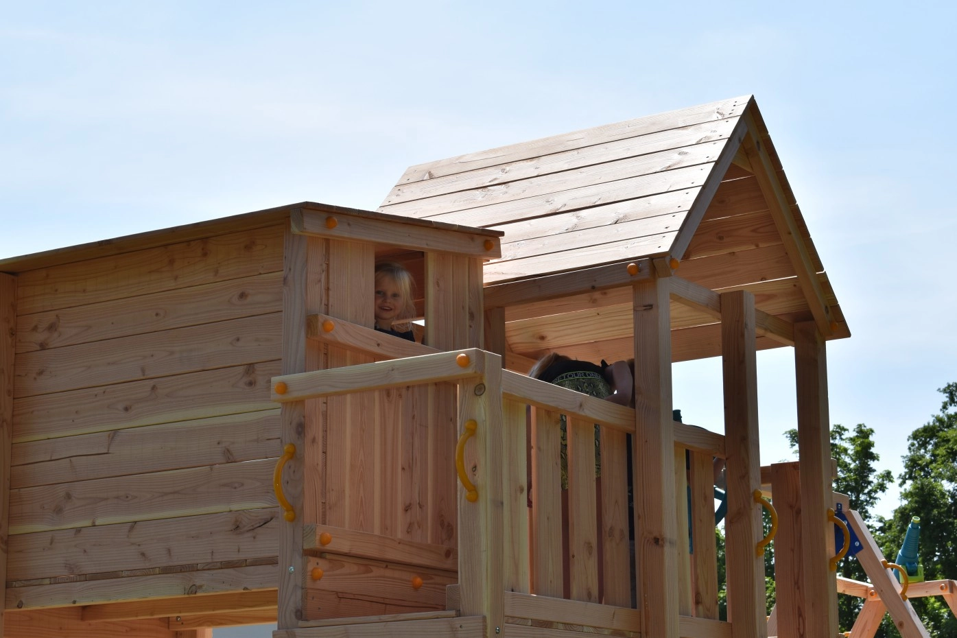 De grote speeltoren Palazzo in douglashout is een unieke toren met veel uitdaging om te spelen. Het speelplateau met balkon op een hoogte van 150cm, is verbonden met een speelhuisje op 170cm hoogte. Een ideale plek om samen met vriendjes of vriendinnetjes te spelen en te verstoppen. Eronder zit een enorme zandbak en een zitgedeelte met een houten vloer. Het bankje heeft een scharnierdeksel, waarop je lekker kunt zitten. Het kan ook gebruikt worden als opslagplek voor speelgoed. Aan de rechter zijkant van het speelhuis zijn 2 RVS duikelstangen geplaatst, van 125cm lengte. Dit geeft nog meer speelplezier aan deze mega speeltoren.