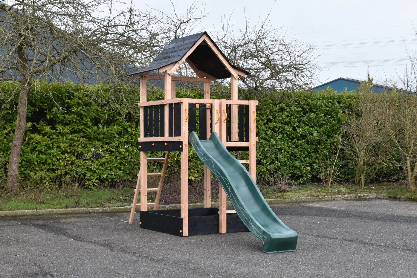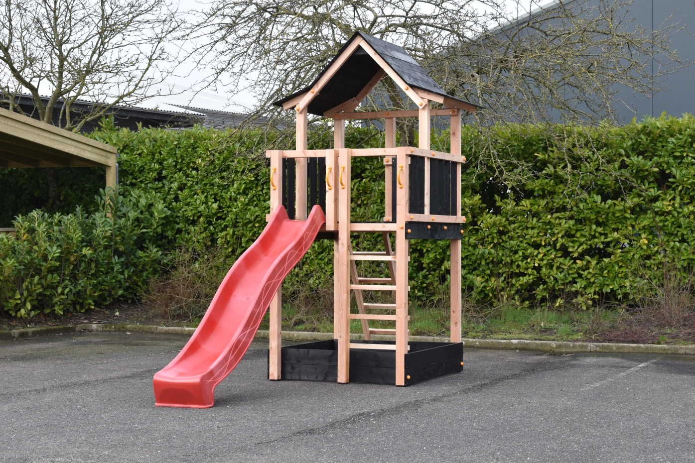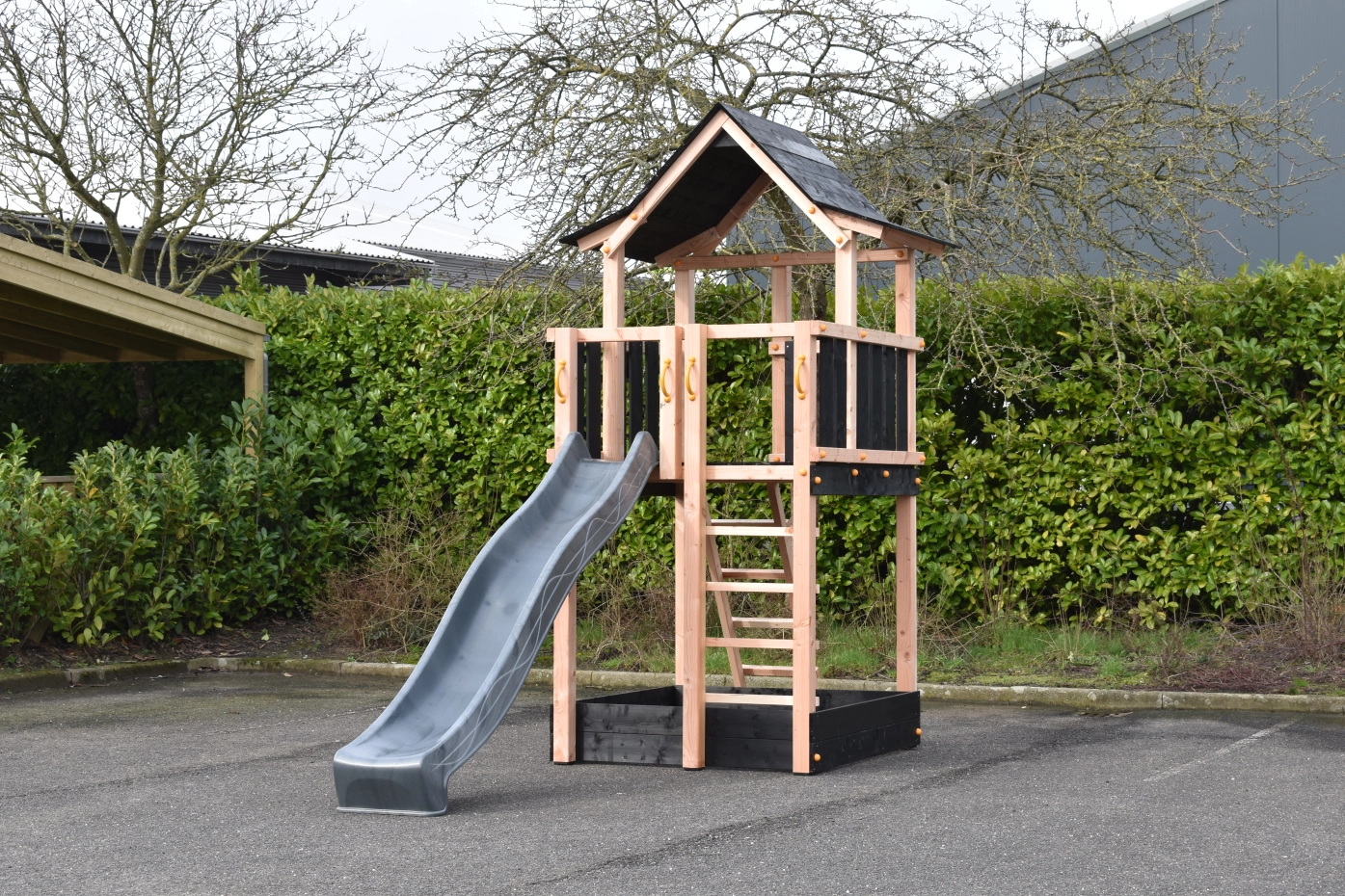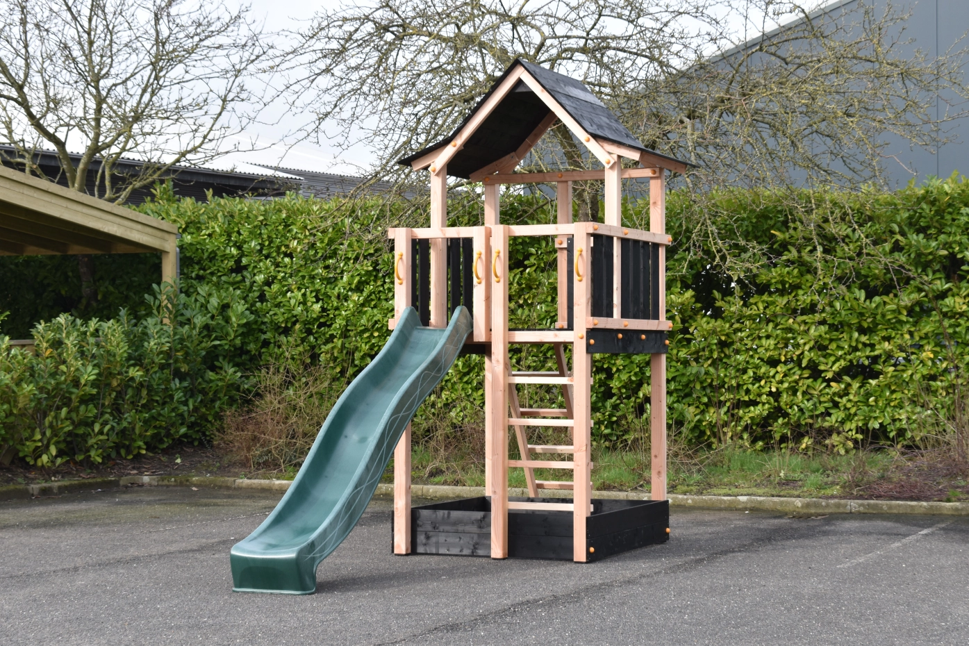 Speeltoren Pagoda gemaakt van Douglashout gecombineerd met zwart geïmpregneerd vuren planken. Groot speelhuis met wel 3 uitgangen bovenin. Voorzien van 2 trapjes en een glijbaan, met de mogelijkheid voor een klimwand of brandweerpaal. Groot oppervlak aan speelruimte waarvan een deel een overkapping heeft met een erg speels houten dak.