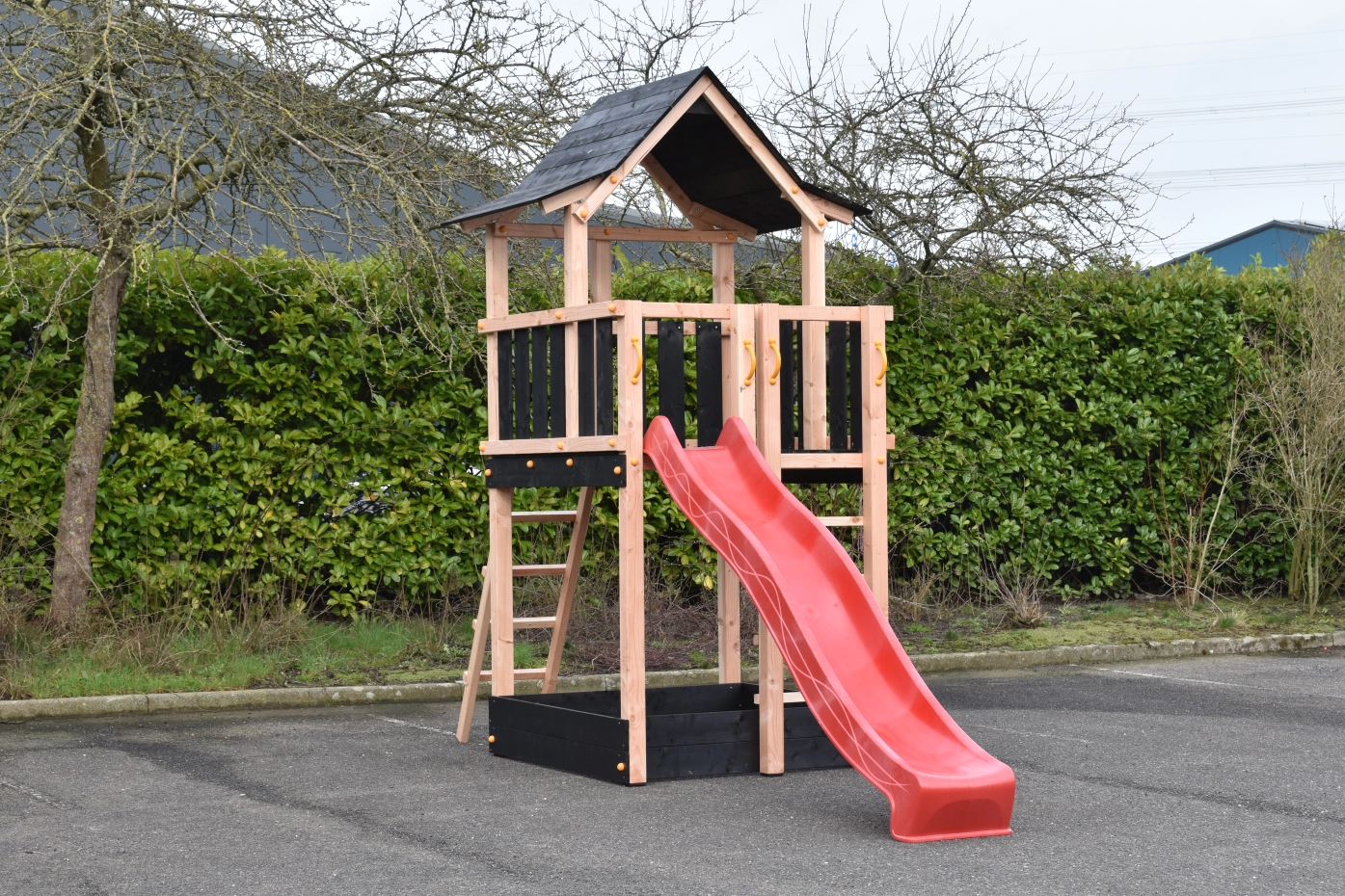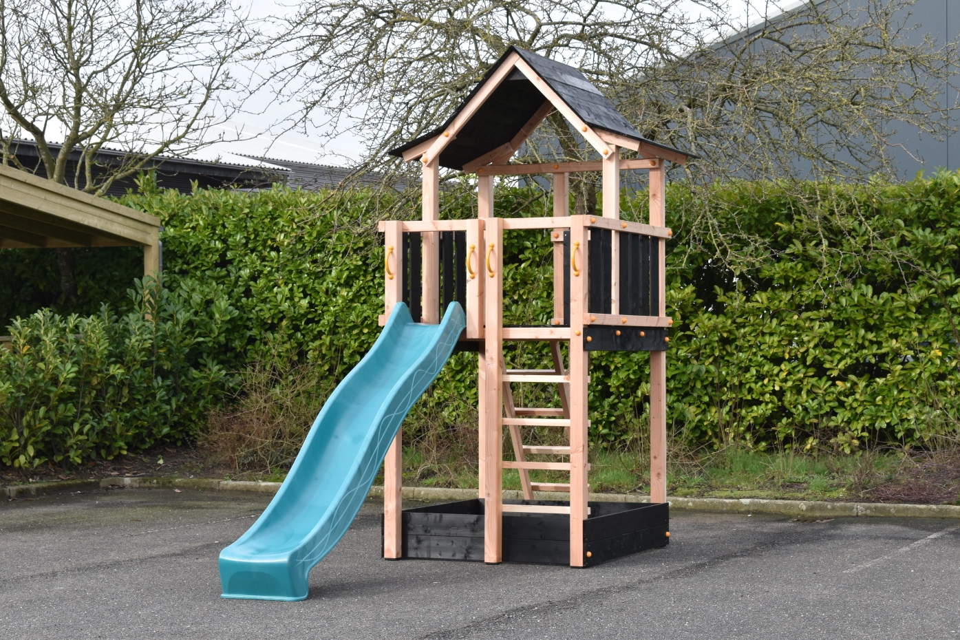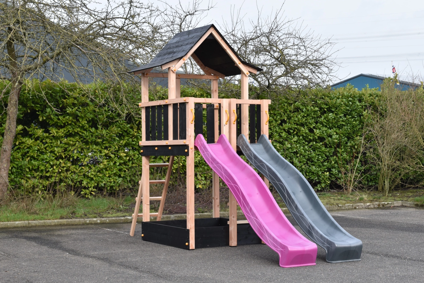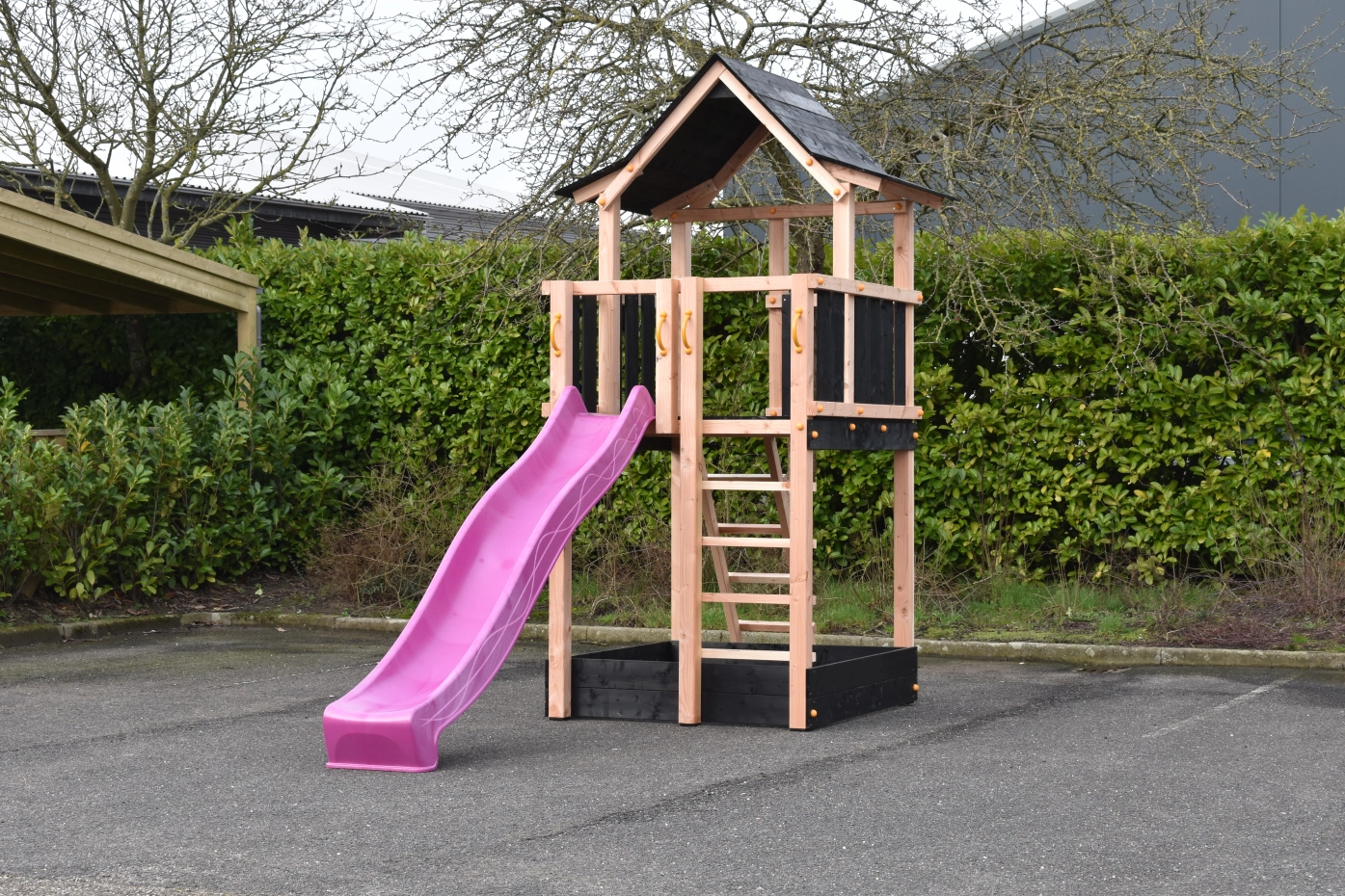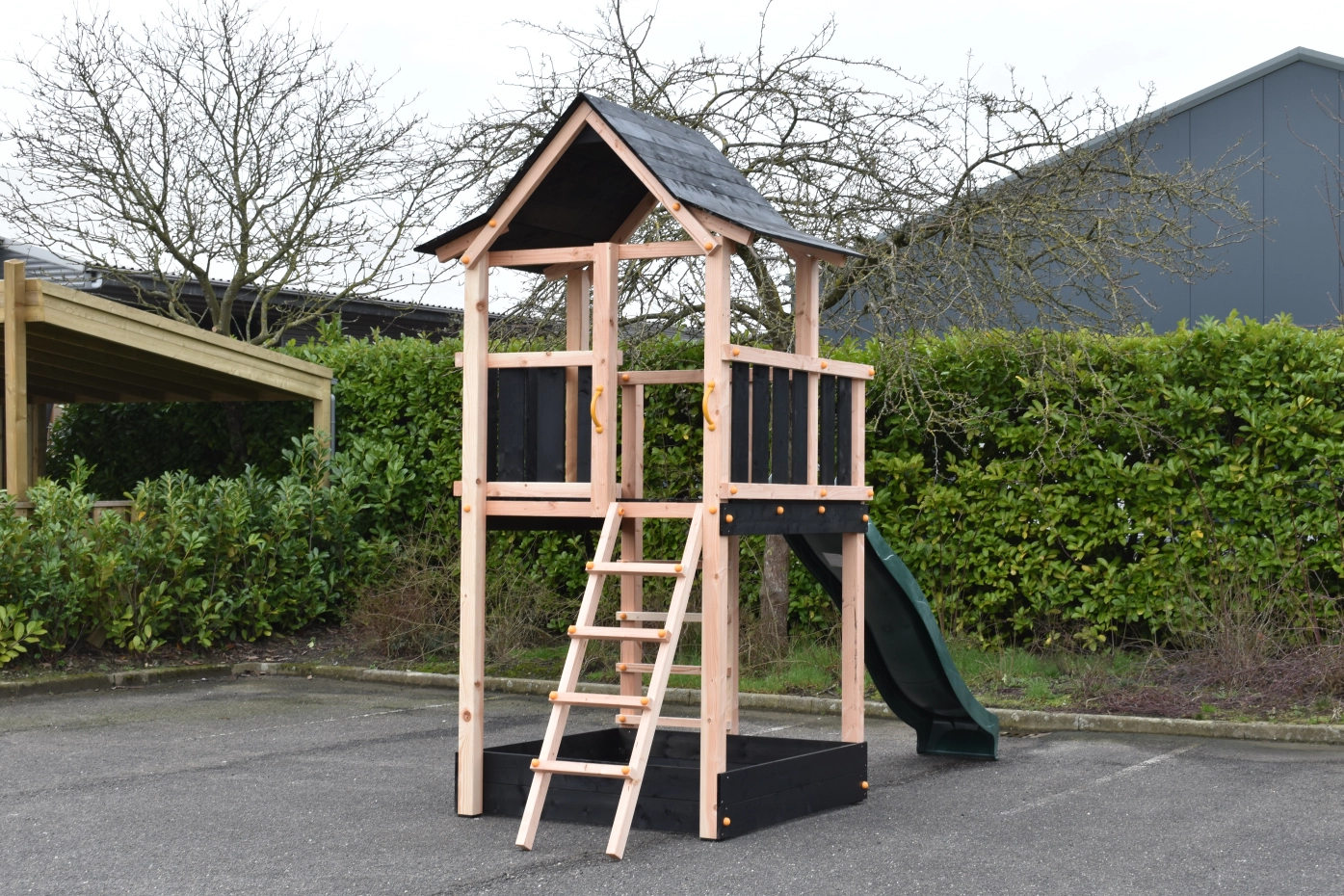 Speeltoren Pagoda gemaakt van Douglashout gecombineerd met zwart geïmpregneerd vuren planken. Groot speelhuis met wel 3 uitgangen bovenin. Voorzien van 2 trapjes en een glijbaan, met de mogelijkheid voor een klimwand of brandweerpaal. Groot oppervlak aan speelruimte waarvan een deel een overkapping heeft met een erg speels houten dak.