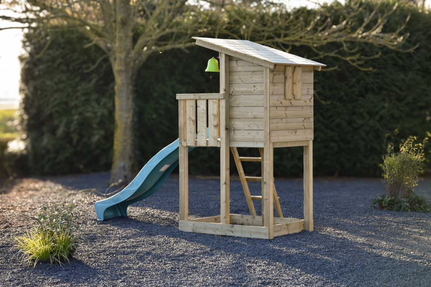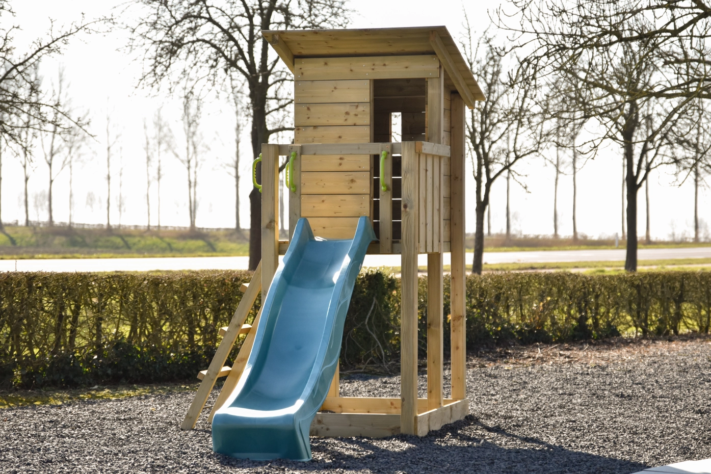 De reling zorgt voor een knusse, veilige speelplek, en de glijbaan staat garant voor eindeloos veel plezier. Ook kan het speeltoestel opgefleurd worden met onze mooie accessoires! Zo kunnen kinderen heerlijk samen spelen, lachen en genieten van het buiten zijn.