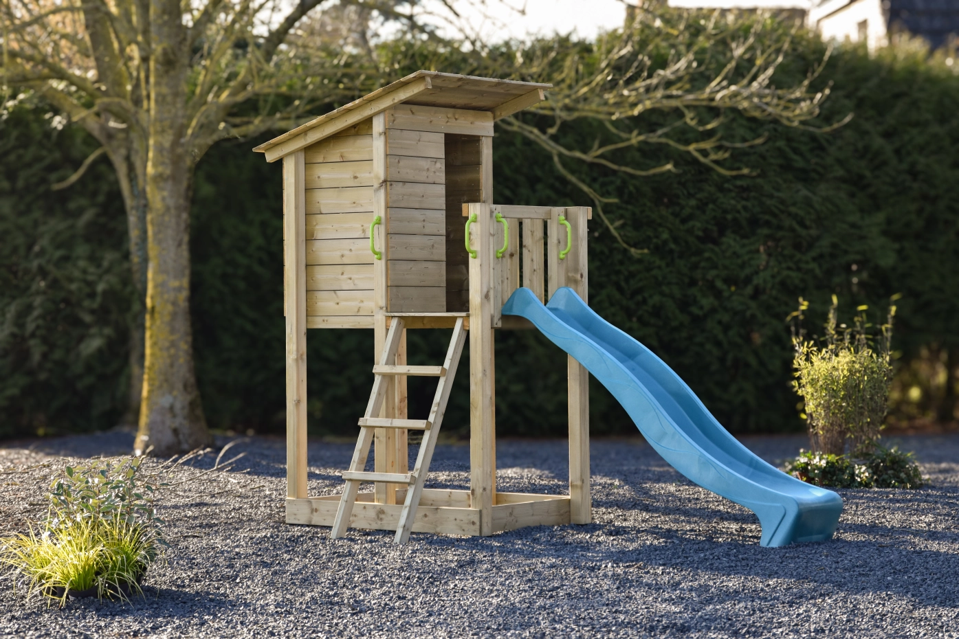 Het is mogelijk om de trap en de glijbaan, links, rechts of aan de voorkant te plaatsen. Door deze mogelijkheden past hij op elke plek in uw tuin!