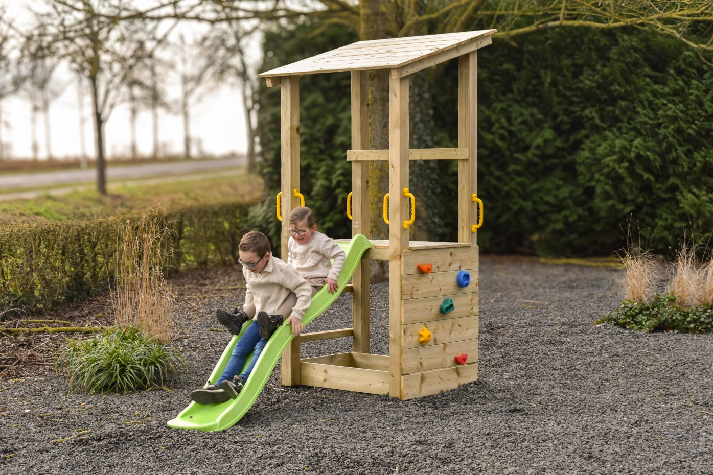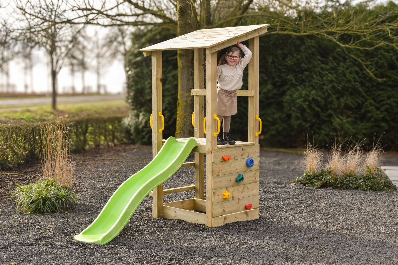 Het houten speelhuisje Plan 90 staat garant voor urenlang speelplezier voor avontuurlijke kinderen. Dankzij de robuuste constructie van geïmpregneerd hout biedt Plan 90 een veilige en duurzame speelomgeving in de tuin. De glijbaan zorgt voor een vrolijke en snelle afdaling, terwijl de klimwand met kleurrijke grepen kinderen uitdaagt om naar boven te klauteren.