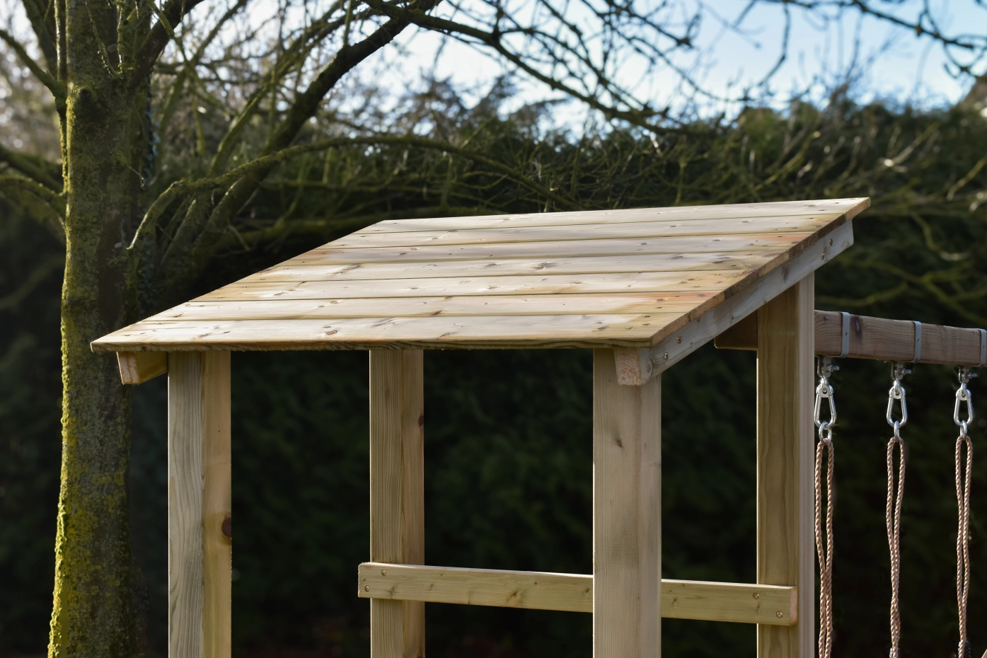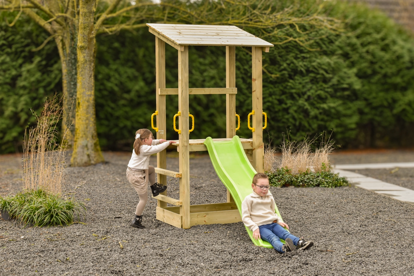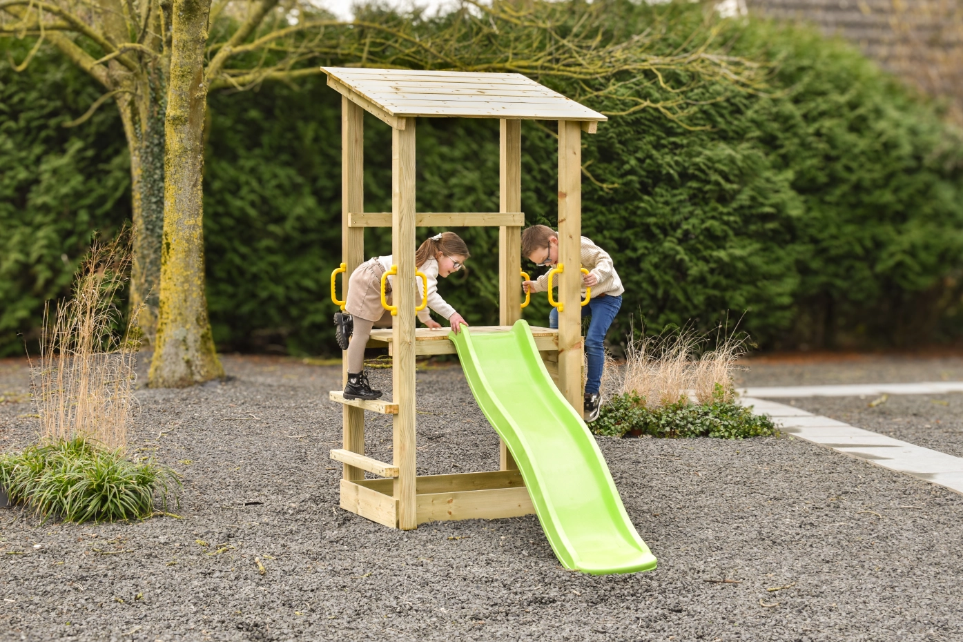 Met stevige handgrepen wordt het klimmen naar het platform nog eenvoudiger en veiliger. Of het nu dienstdoet als geheime boomhut, piratenschip of uitkijkpost: Plan 90 stimuleert de fantasie en nodigt uit tot actief buitenspelen. Ideaal voor kinderen die graag ontdekken, klimmen en glijden!