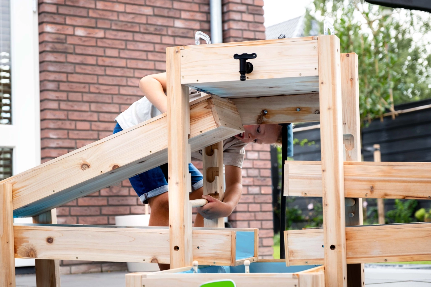 De EXIT AquaFlow waterbaan 400 zorgt voor eindeloos waterplezier in de tuin. Kinderen pompen zelf het water omhoog, bedienen sluizen en volgen hoe het water door de banen stroomt. De naam 400 verwijst naar de bijna 4 meter die een bootje kan afleggen. Met een lengte van 2,20 meter en verstelbare hoogtes is hij perfect voor kinderen van 3 tot 8 jaar. De waterbaan is compact op te bergen, duurzaam, veilig en geschikt voor meerdere kinderen tegelijk.