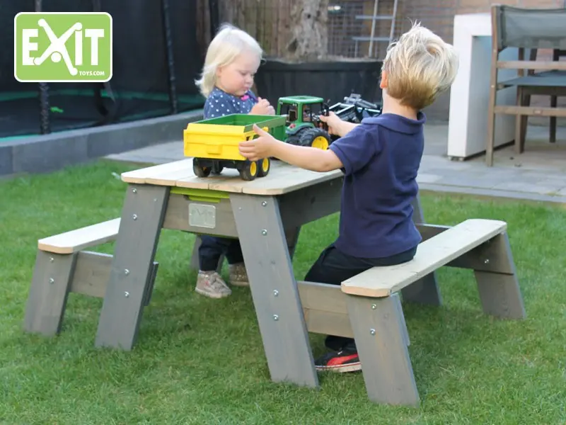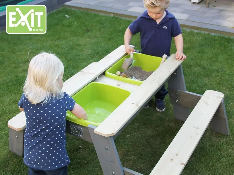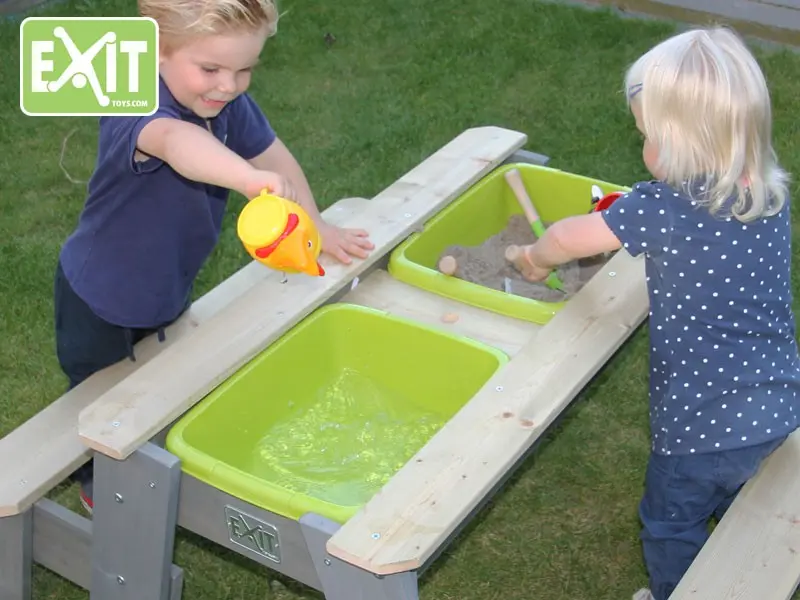 Deze EXIT zand- en watertafel is multifunctioneel. Onder het afneembare tafelblad zit een zandbak! Daarnaast bevindt zich nog een bak die bijvoorbeeld gevuld kan worden met water. Zo kunnen de kinderen met zand of met water spelen, dit valt natuurlijk ook te combineren. Als de kinderen uitgespeeld zijn kan het tafelblad terug geschoven worden, zodat het weer een echte picknicktafel wordt. De zand- en watertafel is uitgevoerd met 2 bankjes. De geïntegreerde kunststof bakken zijn uitneembaar, zodat ze makkelijk schoongemaakt kunnen worden.