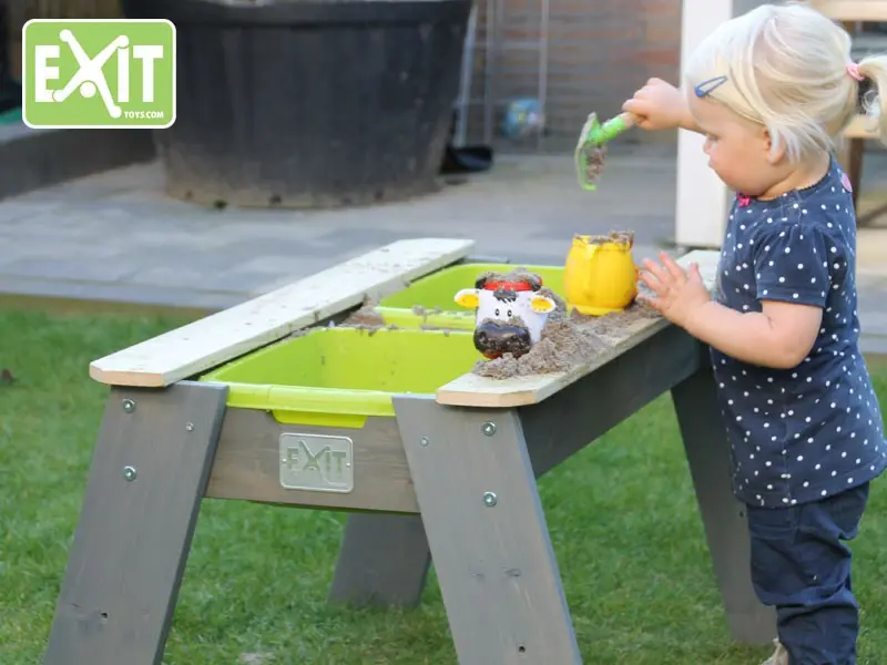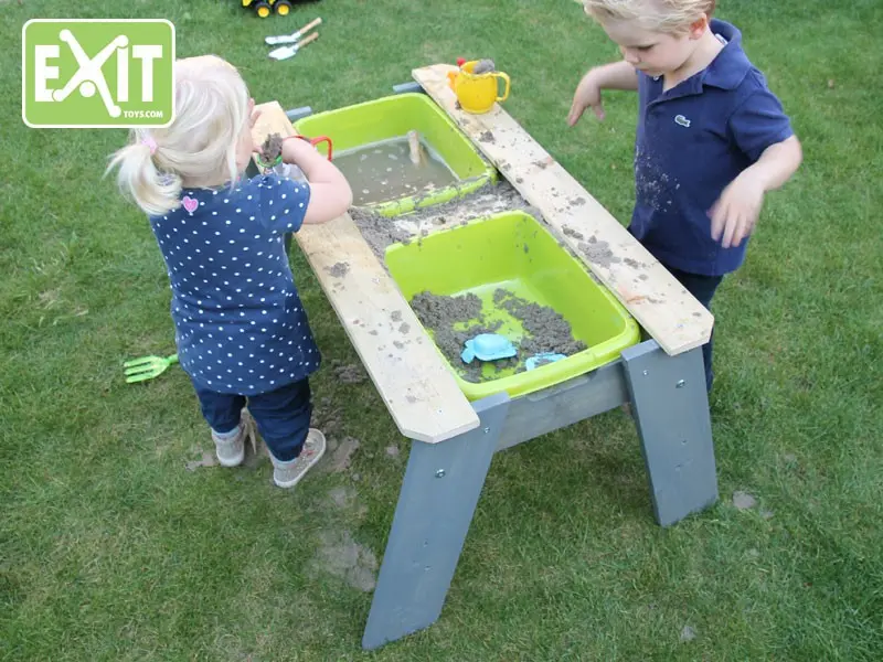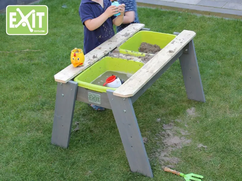 De zand- en watertafel is een multifunctionele tafel. Hij kan gebruikt worden als zandtafel, watertafel en als een normale tafel. Het tafelblad is afneembaar zodat de kinderen het ene moment met zand en water kunnen spelen en het andere moment aan de tafel kunnen knutselen. De geïntegreerde groene bakken zijn uitneembaar, zodat ze na het spelen makkelijk schoongemaakt kunnen worden. Het hout is duurzaam geproduceerd hout en is in een strak design uitgevoerd. Met zijn rustige kleuren staat hij ook mooi in de tuin!
